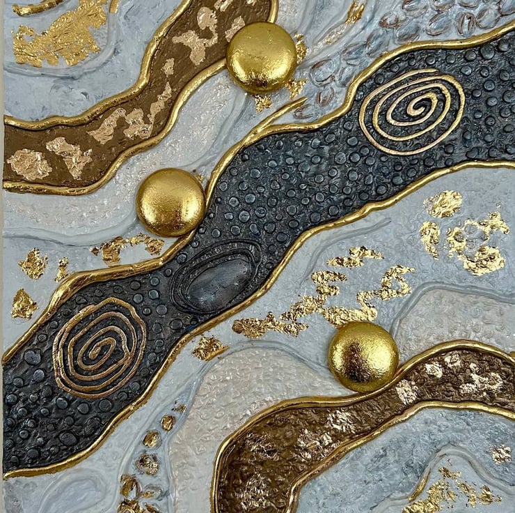 Accents of gold leaf symbolize moments of memory that remain luminous: those we carry with particular warmth, pain, or emotional significance. Circular elements and spiral motifs suggest continuity, cycles, and the quiet movement of time, while darker textured paths introduce depth and transformation.