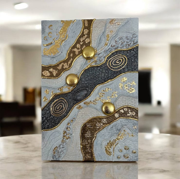 Fragments of Remembrance is a tactile abstract mixed media artwork exploring memory as a layered, fragile, and precious experience. Soft stone-grey and muted blue tones create a calm, contemplative atmosphere, while raised textures and flowing organic lines evoke geological strata — fragments of time preserved within matter.