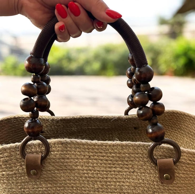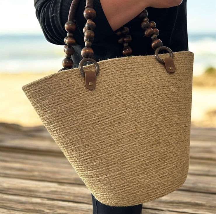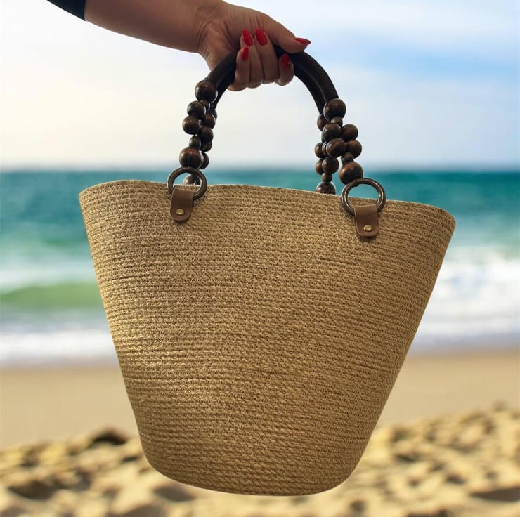 Handmade Jute Tote Bag with Wooden Bead Handles Natural Summer Beach & Market Ba