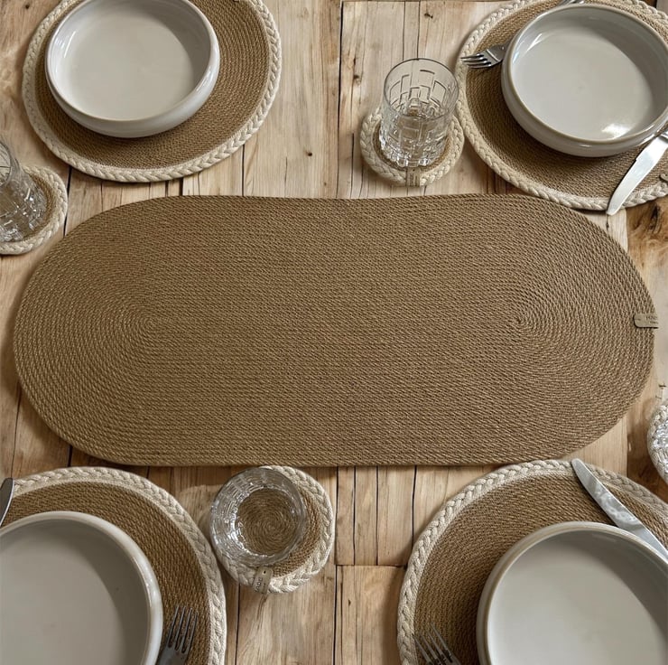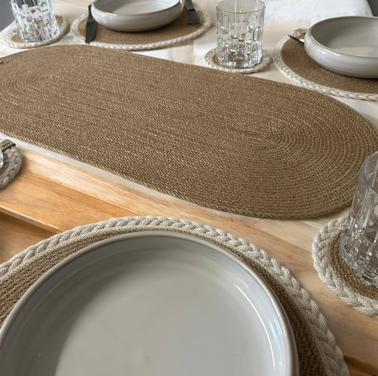 Add natural warmth and texture to your table with this handmade oval jute table runner.