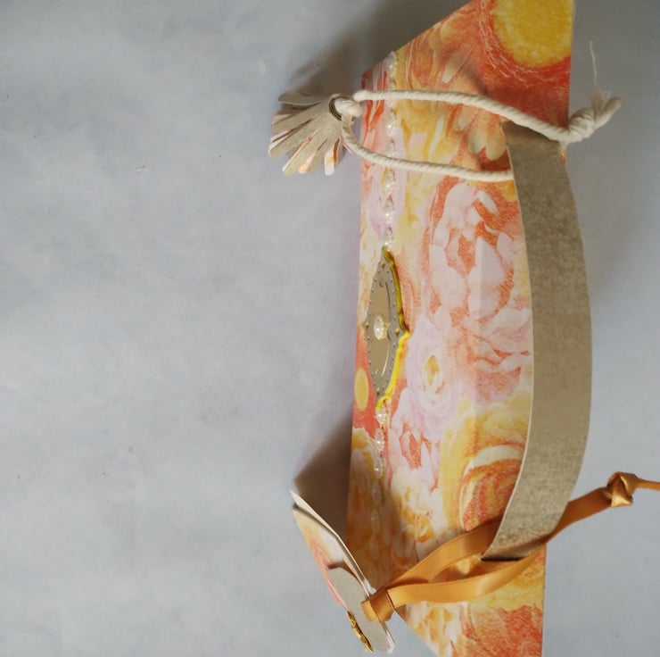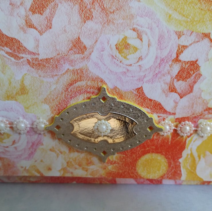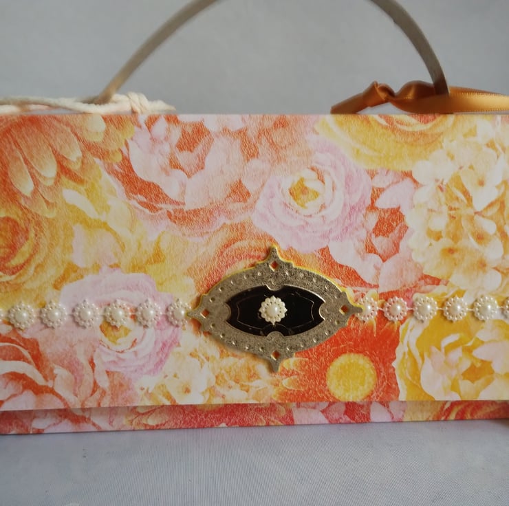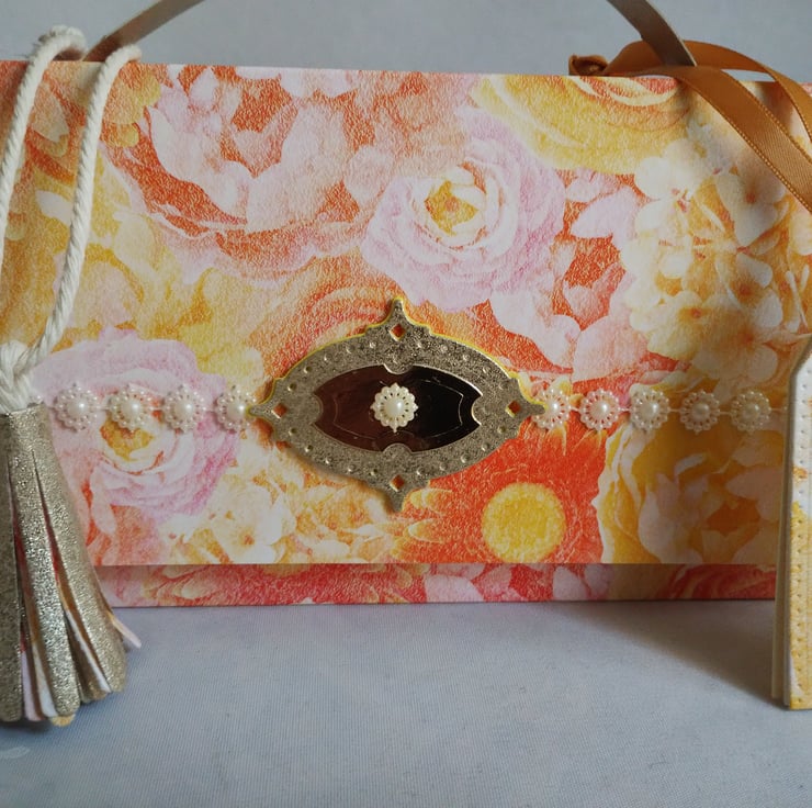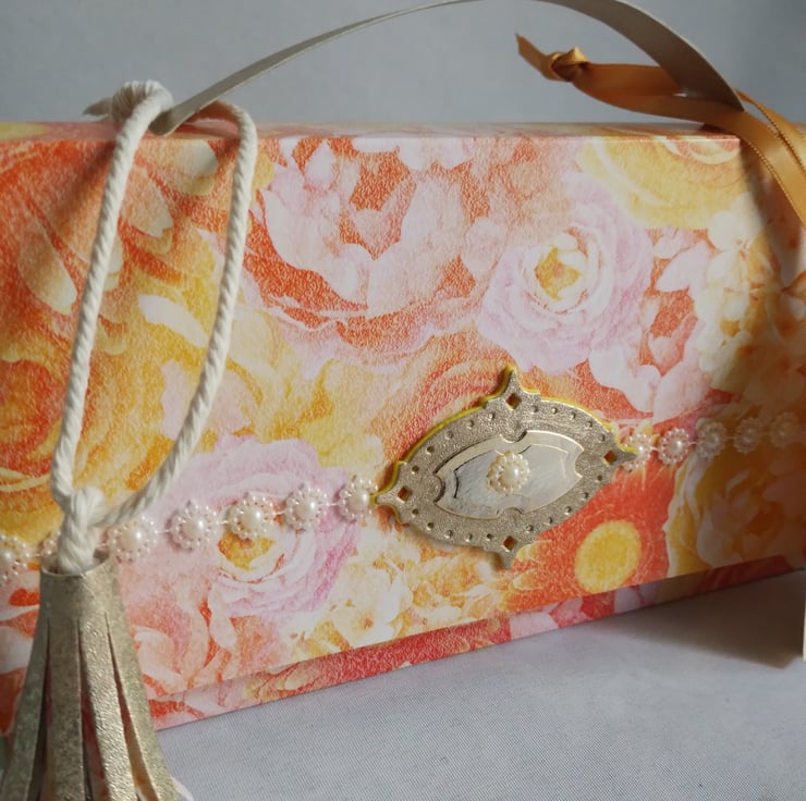 I've made this gift box from gorgeous premium quality orange, yellow and pink blooms cardstock to front and back and with a golden foiled styled thick flexible paper to the sides and for the handle. I've decorated the front flap with a beautiful foiled gold and mirri-card 'clasp' and a line of gorgeous flat backed 'pearl' flowers.