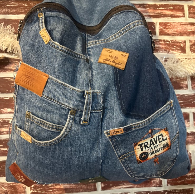 Denim rucksack made of upcycled pieces of jeans. Handmade, with a spacious inside pocket, a zipper at the top and three outside pockets.