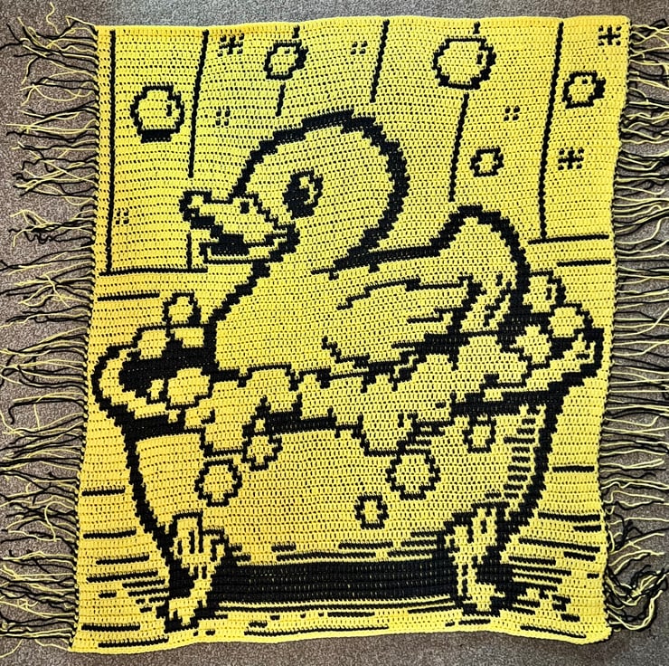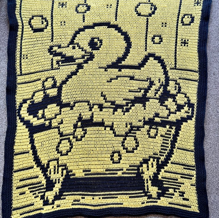 This “Rub-a-Dub Ducky” crochet blanket is full of character and charm. Featuring a sweet little duck enjoying a bubbly bath, it’s the perfect mix of fun and cosy.