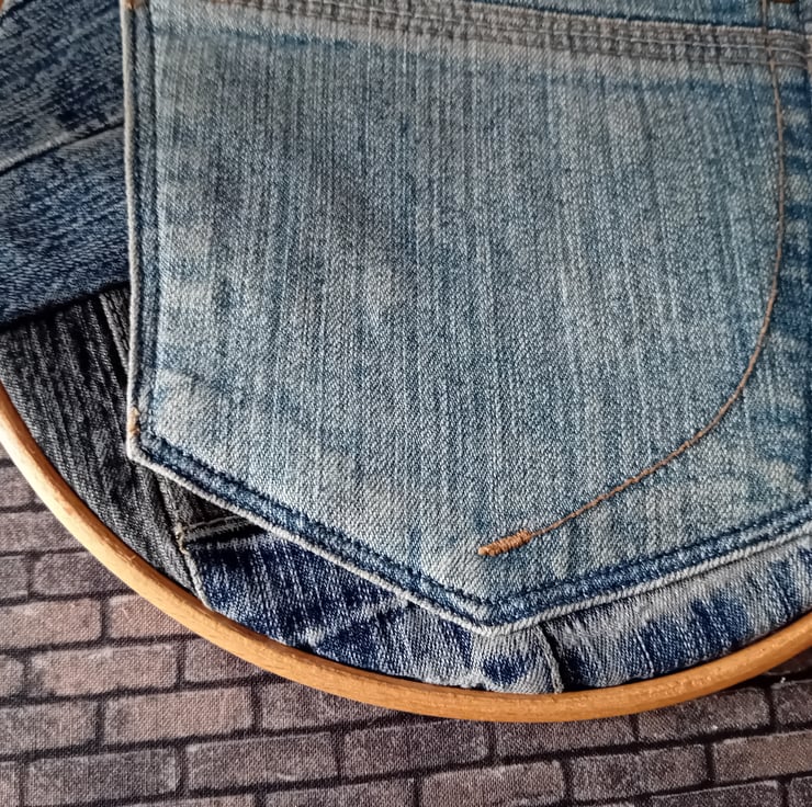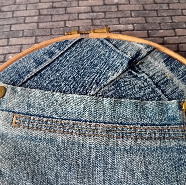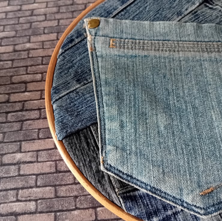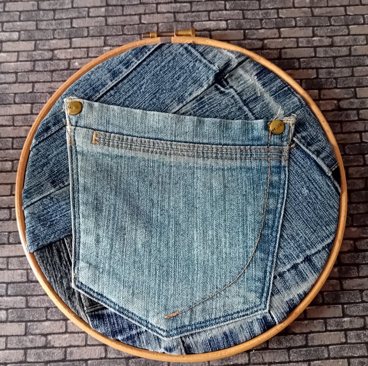 Sustainability for us means: using what we have found. Upcycling, reworking, and re-imagining materials.And using every part of each garment. We often have denim pockets and scraps left over from bigger projects. And when we realised just how many embroidery hoops we had collected from charity shops, we combined the two to produce some quirky storage.