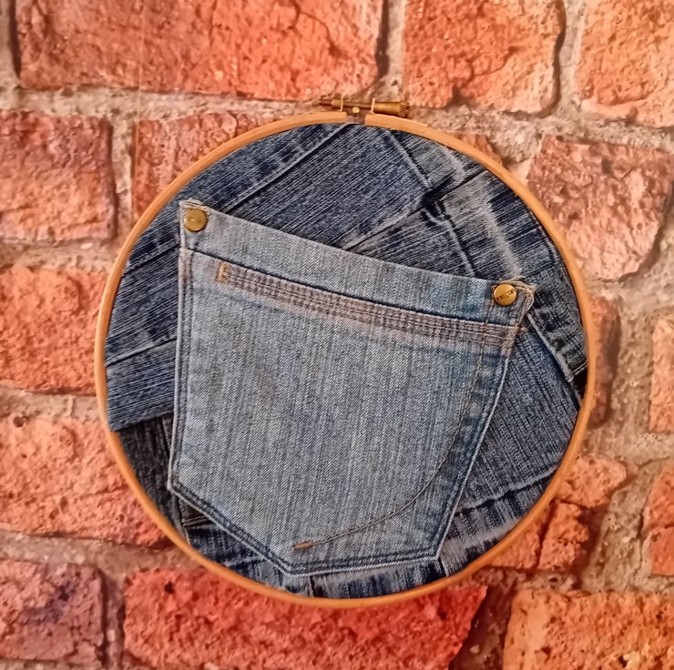 This clever little wall organiser is made from reclaimed denim scraps and pockets, rescued from old jeans used in our other projects. Every piece is one-of-a-kind, stitched together with care and framed in a wooden embroidery hoop, ready to hang.