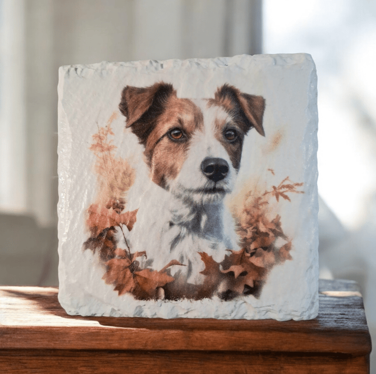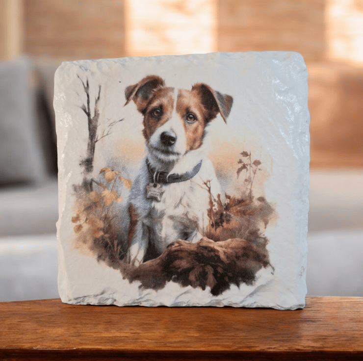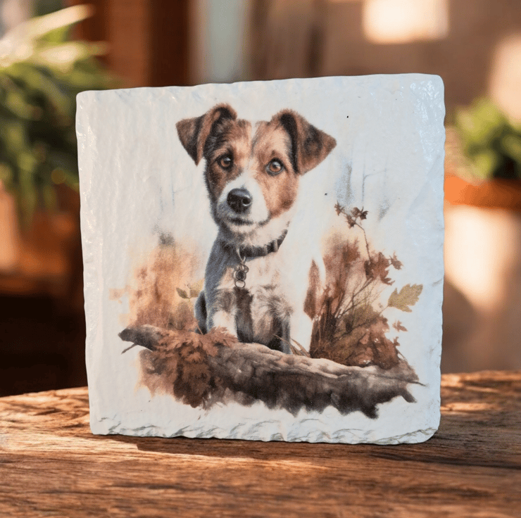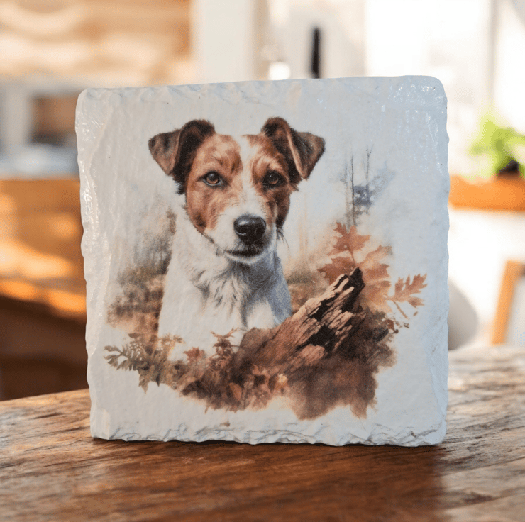 This 4 piece slate coaster set has been hand painted and decoupaged with a beautiful Jack Russell dog.