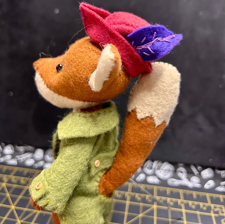He is hand sewn using a good quality wool blend felt. His eyes are traditional hand made glass eyes and he has a removable peacoat and feathered hat.