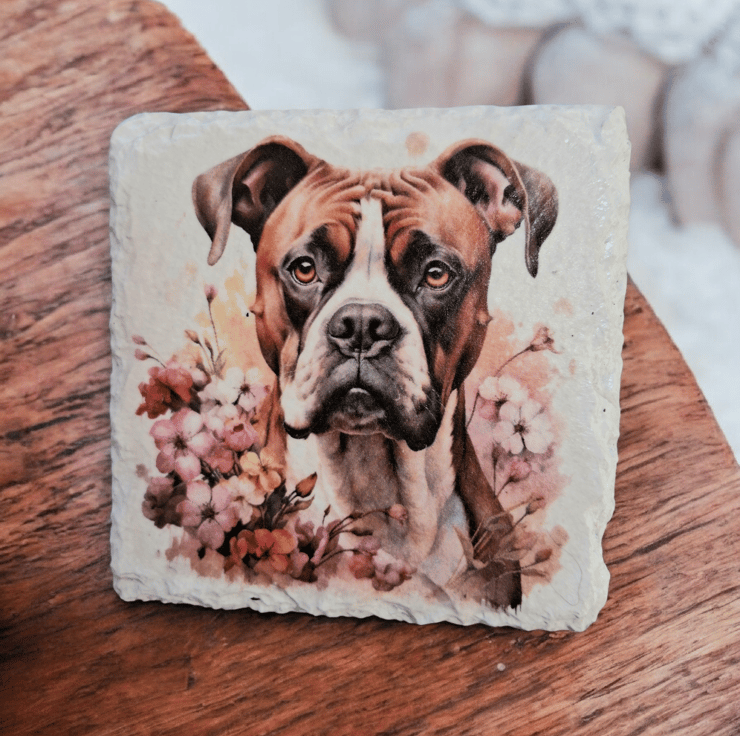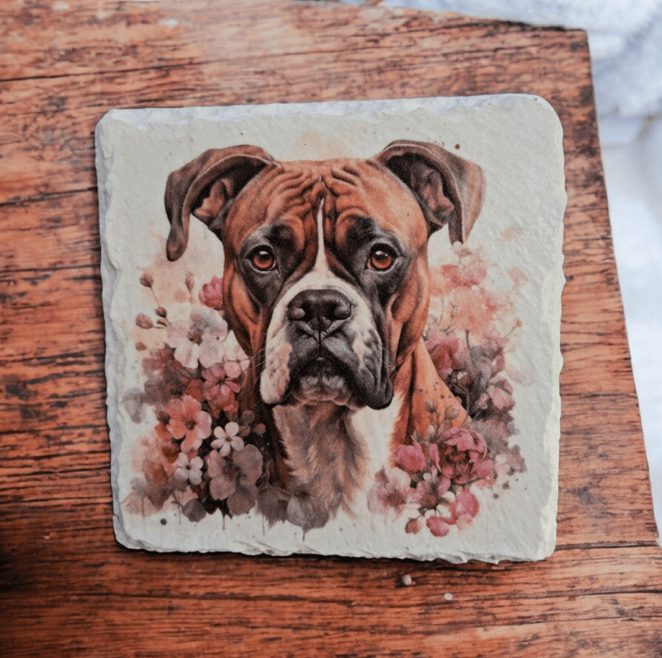 This 4 piece slate coaster set has been hand painted white and decoipaged with beautiful Boxer Dogs in various positions.