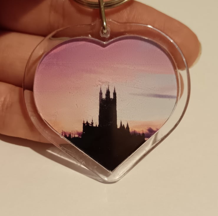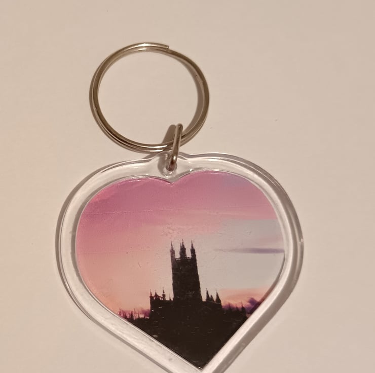Stunning pink and purple silhouette photography of Gloucester Cathedral in a heart shaped keyring.