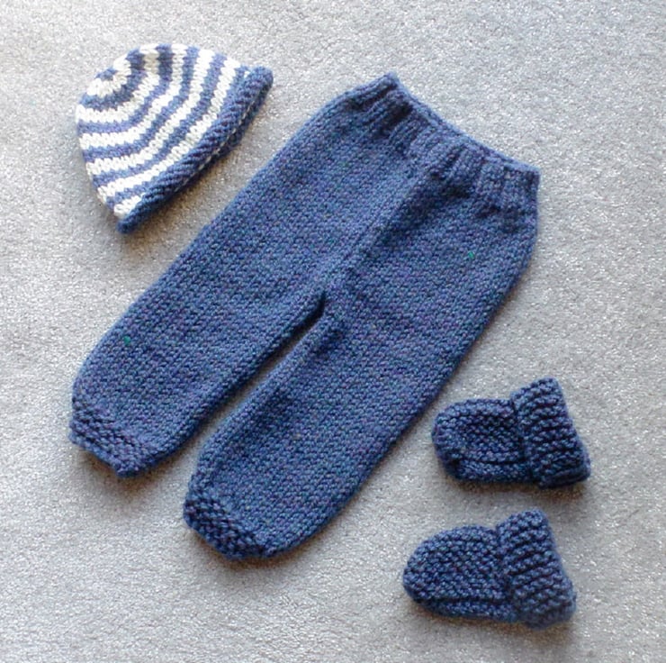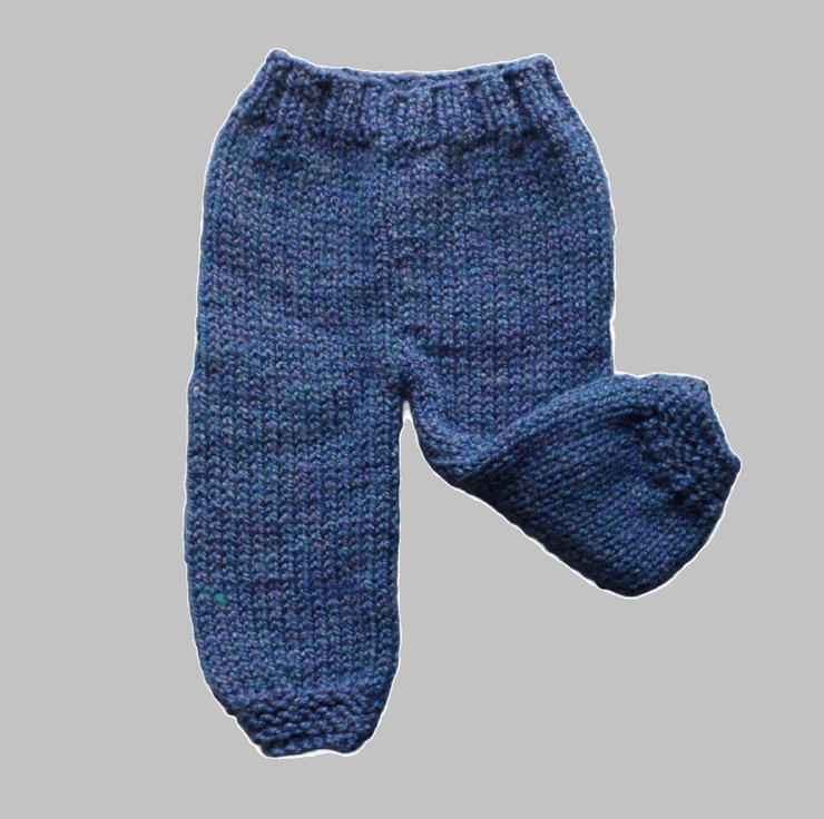 To fit chest: 31 (36: 41: 46: 51: 56: 61) cm or 12 (14: 16: 18: 20: 22: 24) inches. Length of trousers: 29 (31: 34: 39: 42: 44: 47) cm or 11.5 (12.25: 13.25: 15,5: 16.75: 17.5: 18.5) inches. They are knitted in chunky yarn using 5.5 mm and 6 mm knitting needles.