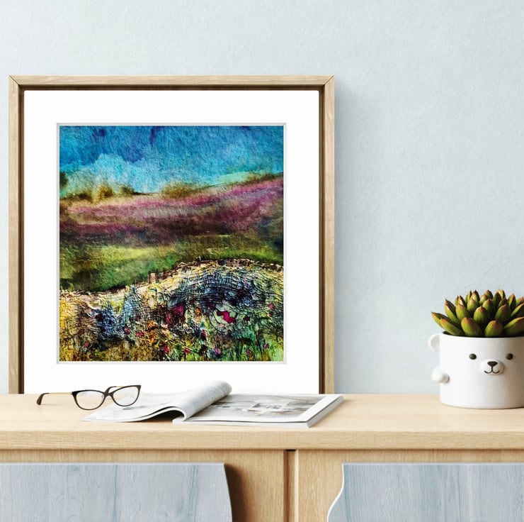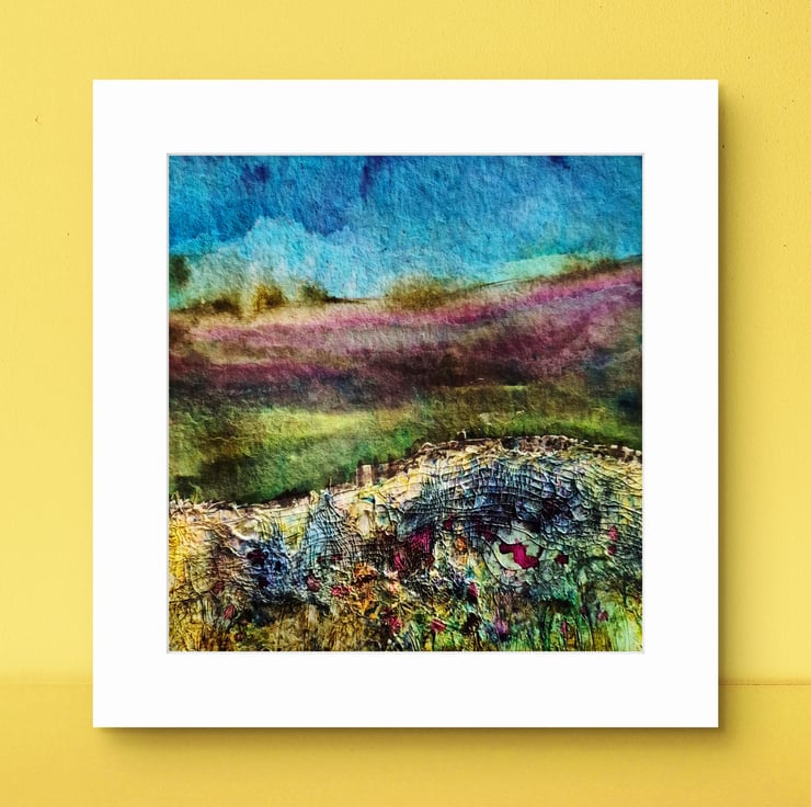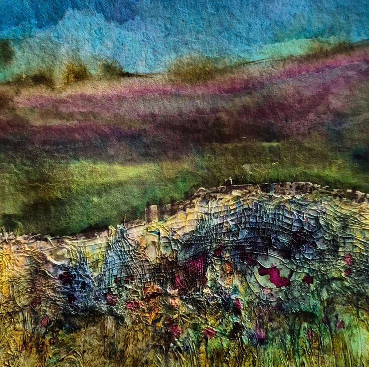 "Silent fields" is a mixed media painting with texture. Created using watercolours , inks and textured fabric.