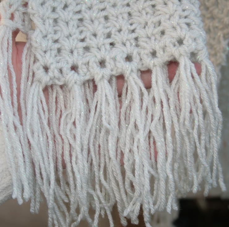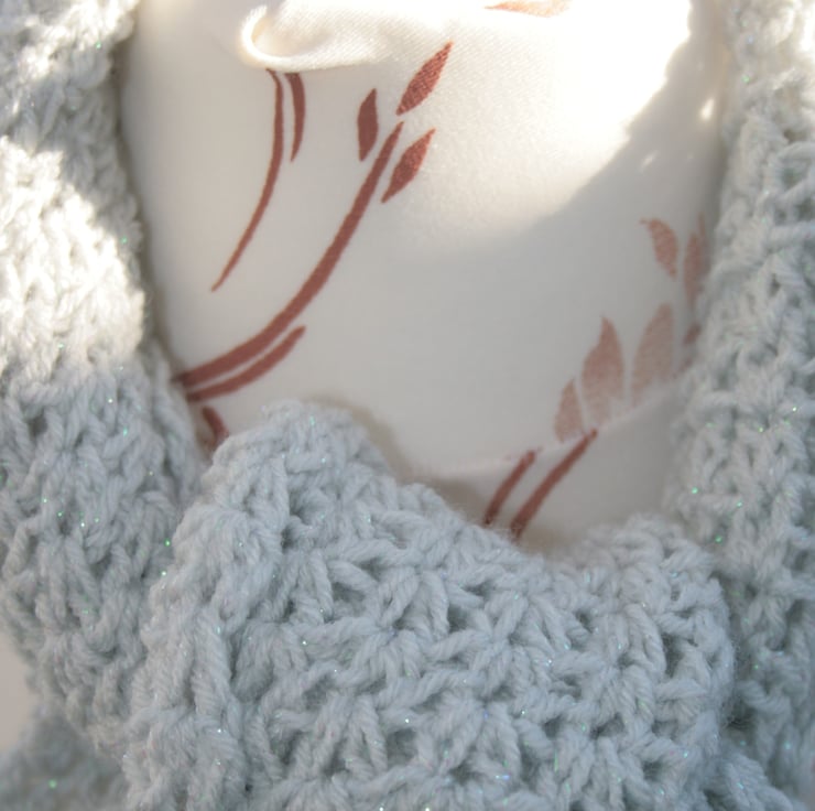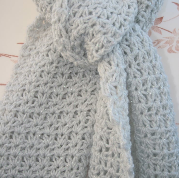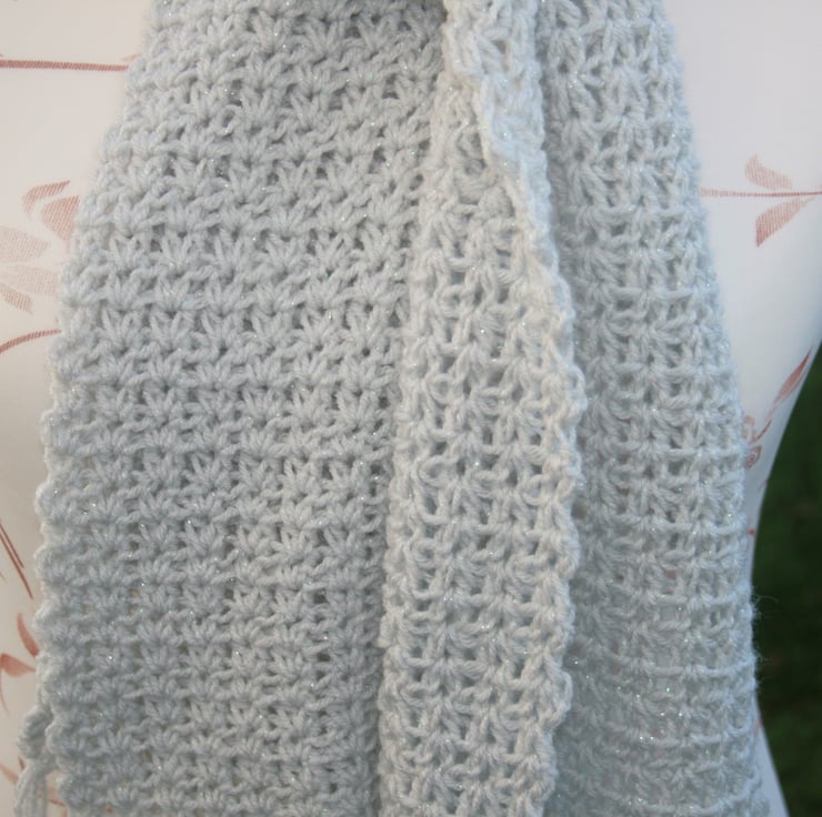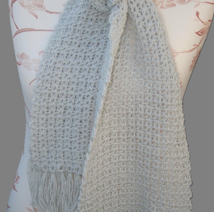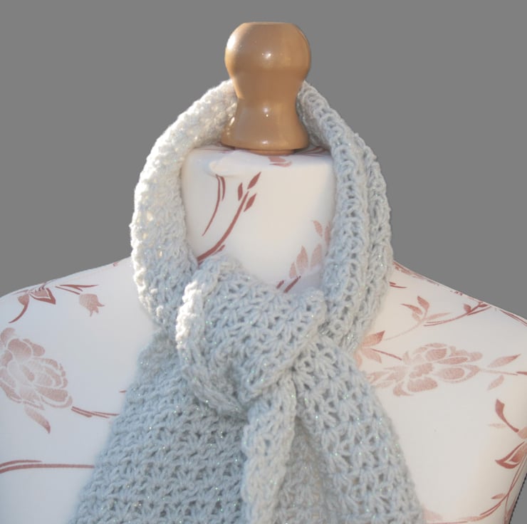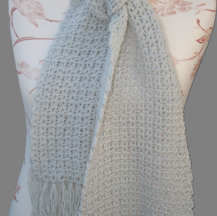 A very pretty, soft pale grey scarf, with a hint of sparkle throughout. The scarf measures approximately 60 inches (L) by 8 and a half inches (W). It is made of 75% Premium Acrylic, 20% Polyamide and 5 % Polyester. Made with kind permission of the original pattern designer.
