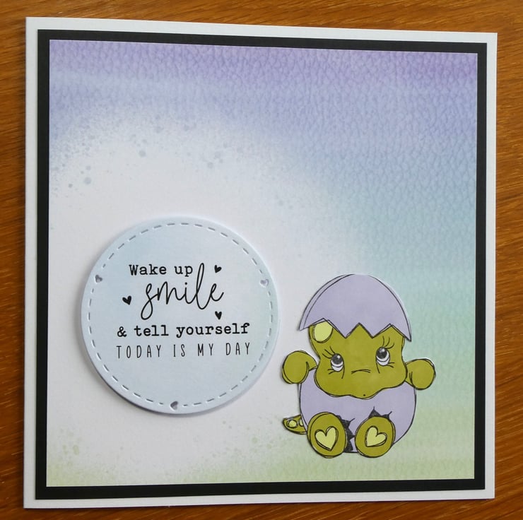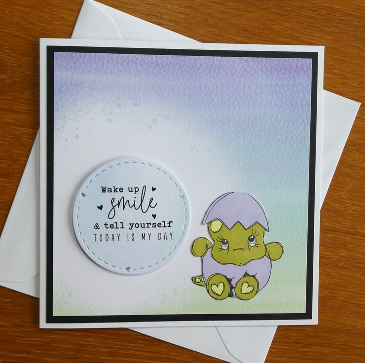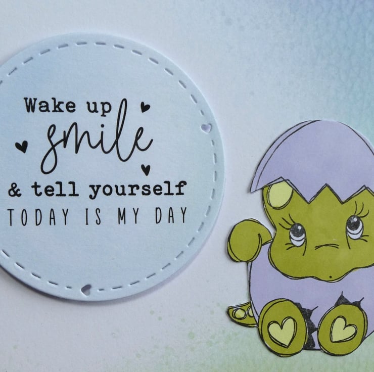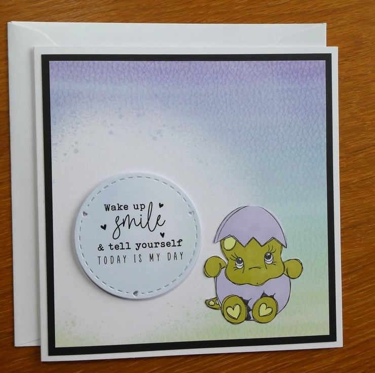 This cute dinosaur birthday card with a sweet image of a dinosaur hatching from an egg and the message 'wake up, smile & tell yourself today is my day' would be suitable to send as a birhday card, good luck card or for many other occasions.