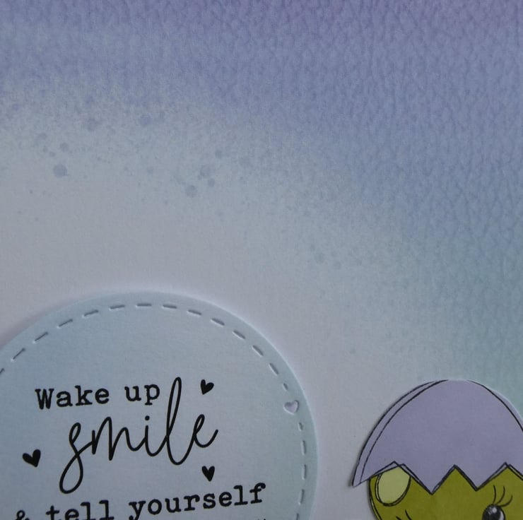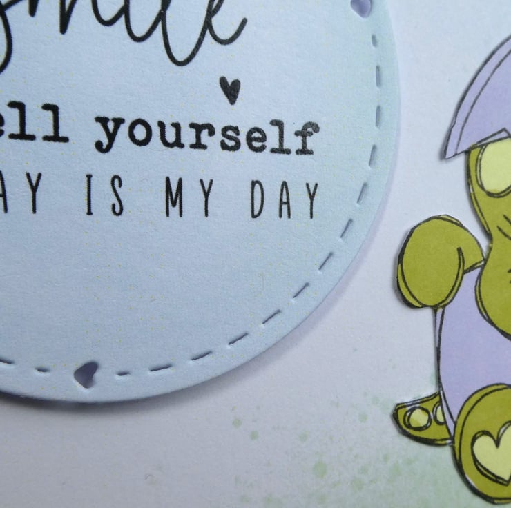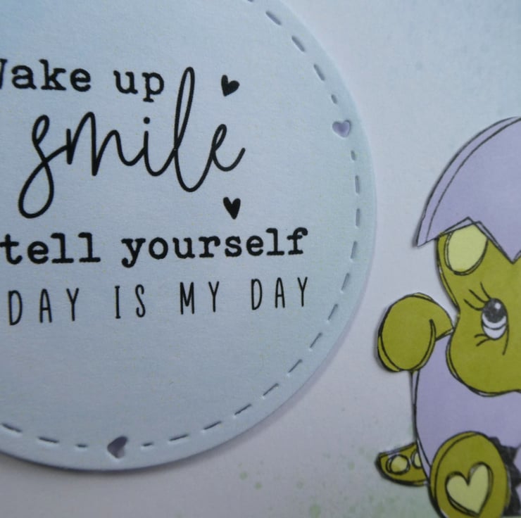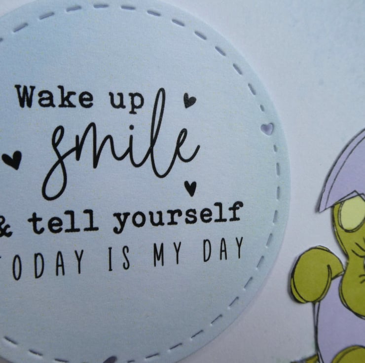 A circular die cut message with the message 'Wake up, smile & tell yourself today is my day' on a pale pastel background has been raised on foam pads to add dimension on the left hand side.