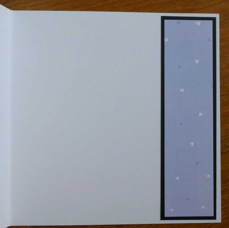 Inside the card is a strip of lilac and white heart patterned paper with a black card frame down the right hand edge.