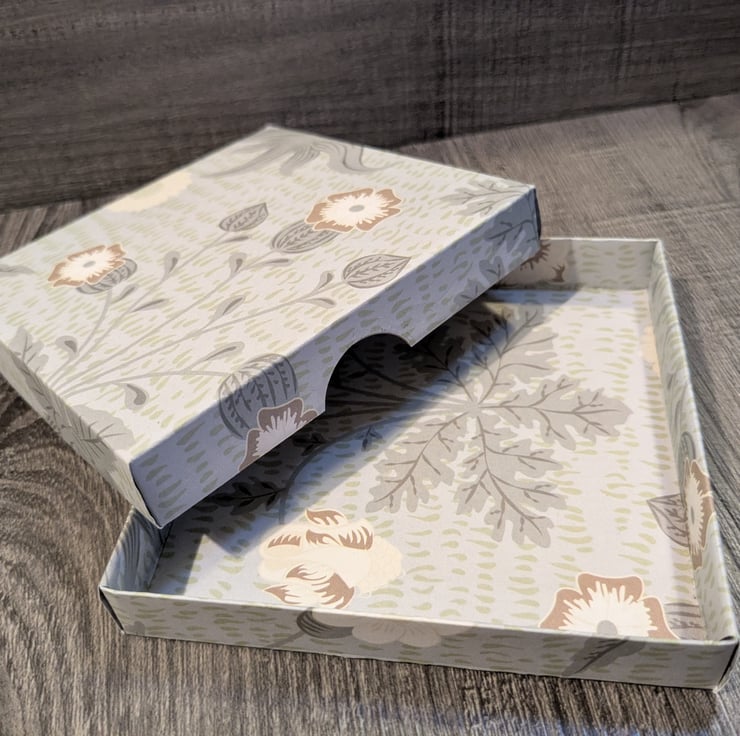 A matching pair of ultra-thin, handmade gift boxes with separate lids in a distinctive pale grey/blue floral pattern.