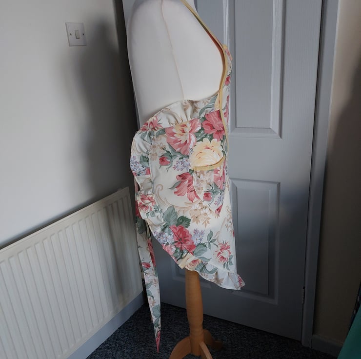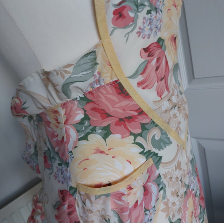 Handmade using a vintage floral fabric and a yellow cotton bias trim