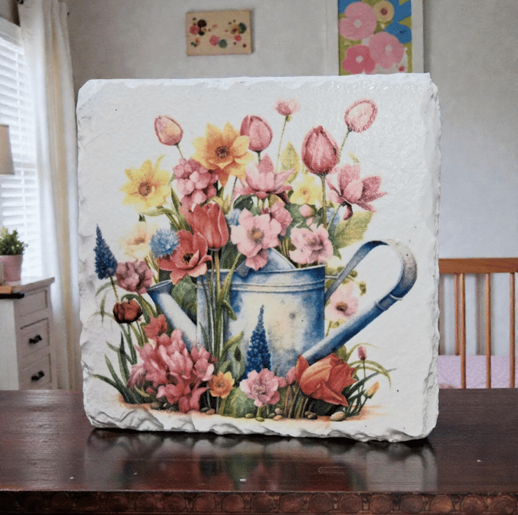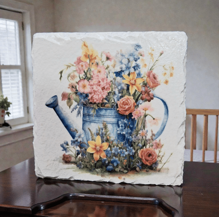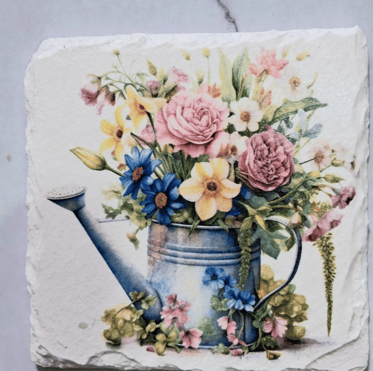 This 4 piece slate coaster set has been hand painted and decoupaged with a beautiful arrangement of flowers in a watering can.