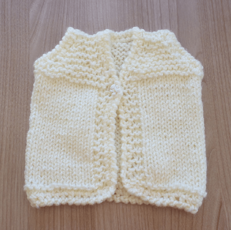 To fit baby; 6 to 12 months. To fit chest size: 60 cm or 24 inch. Length: 26 cm or 10.25 inches. It is knitted in chunky knitting yarn using 6.5 mm knitting needles.