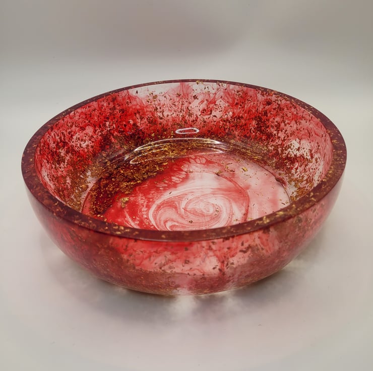 Handmade Resin Bowl with red swirl pattern.