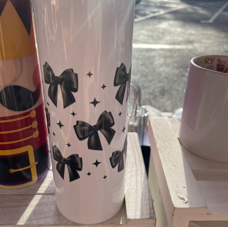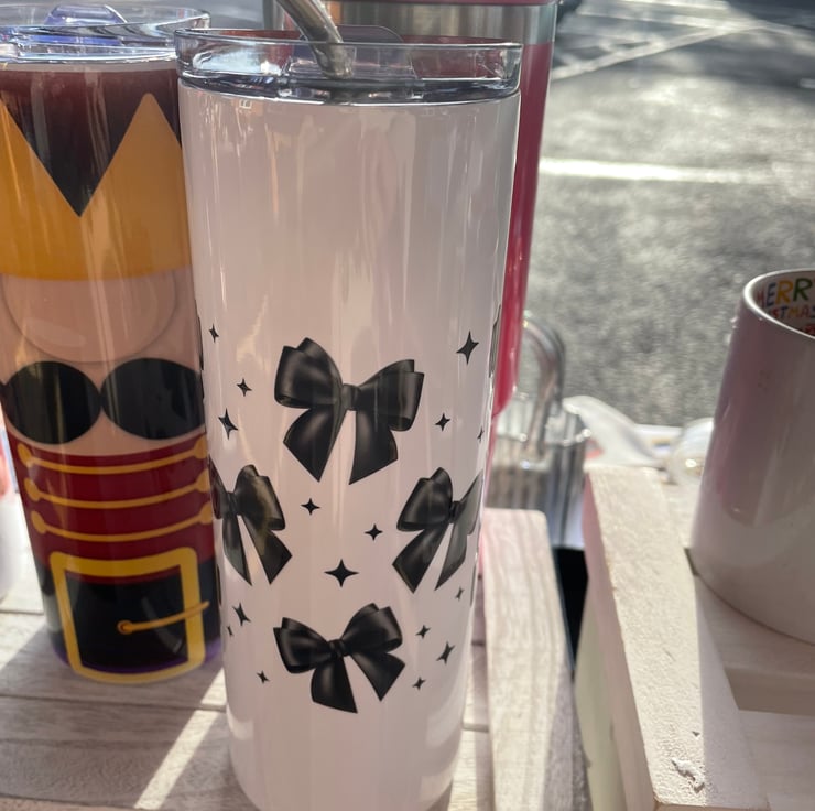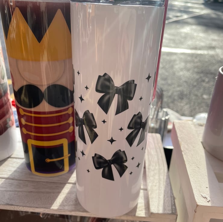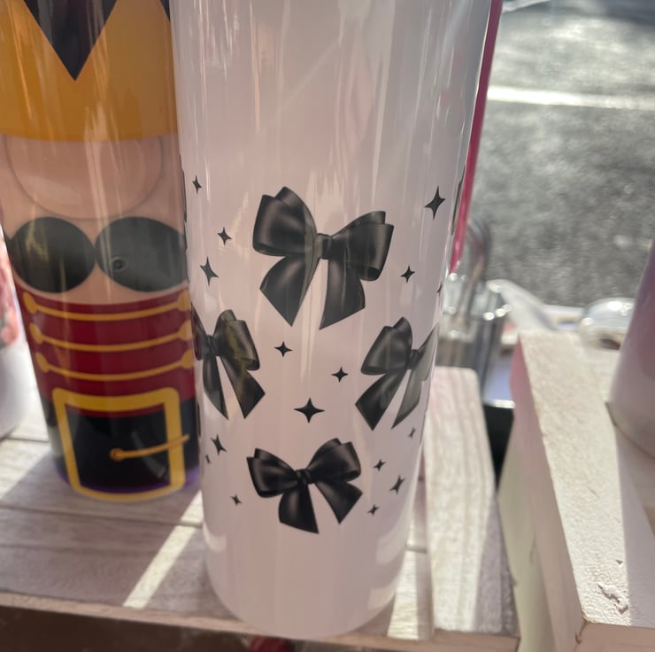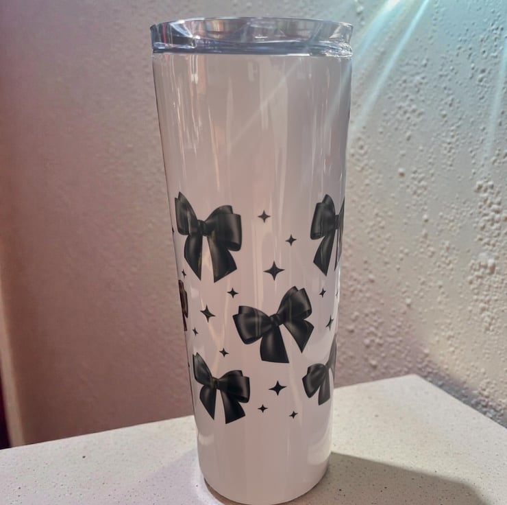 A 20oz metal insulated cup perfect for days out has a flip lift and metal straw I have used the bow design in black using a uvdtf