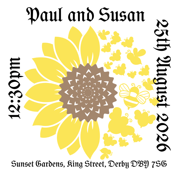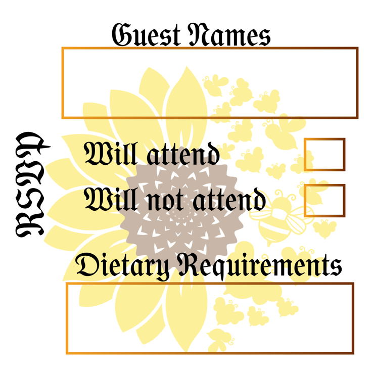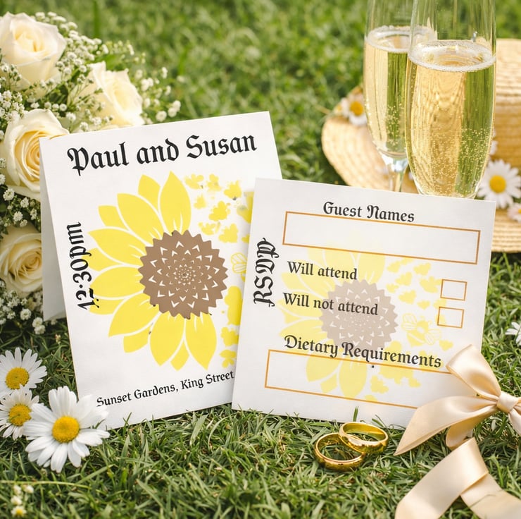 This sunflower wedding invitation, RSVP and details card set with handmade envelopes is designed for couples seeking beautifully coordinated, high-quality wedding stationery with a warm, elegant feel. Featuring a bold sunflower motif with delicate butterfly accents and classic gothic-style typography, this set creates a striking first impression while remaining timeless.