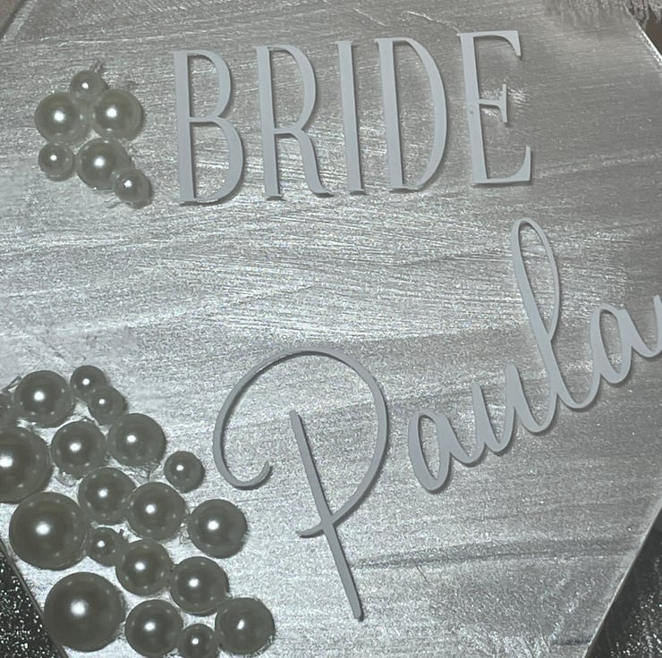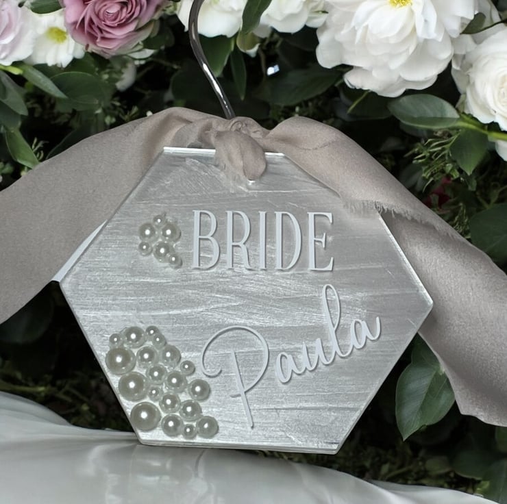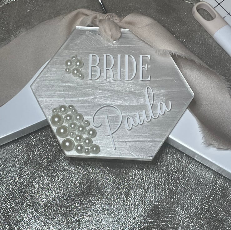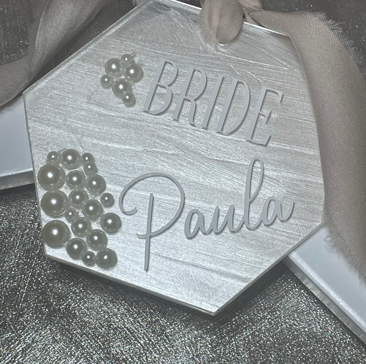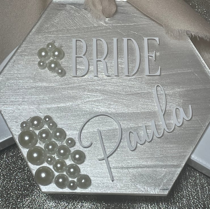 A delux hexagon acrylic in a penalised affect with little pearls added name and role if you wish to be added finished with a ribbon and tied around a wooden hanger