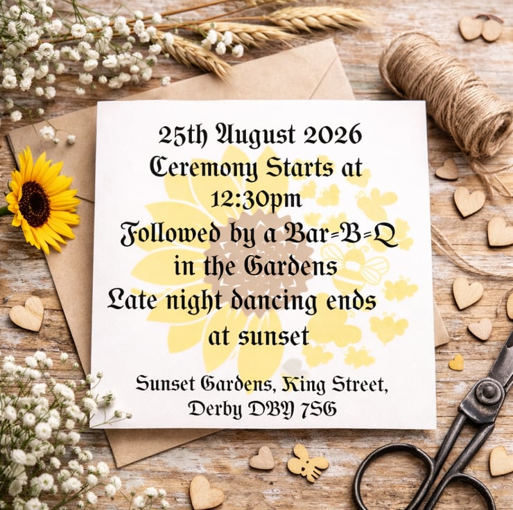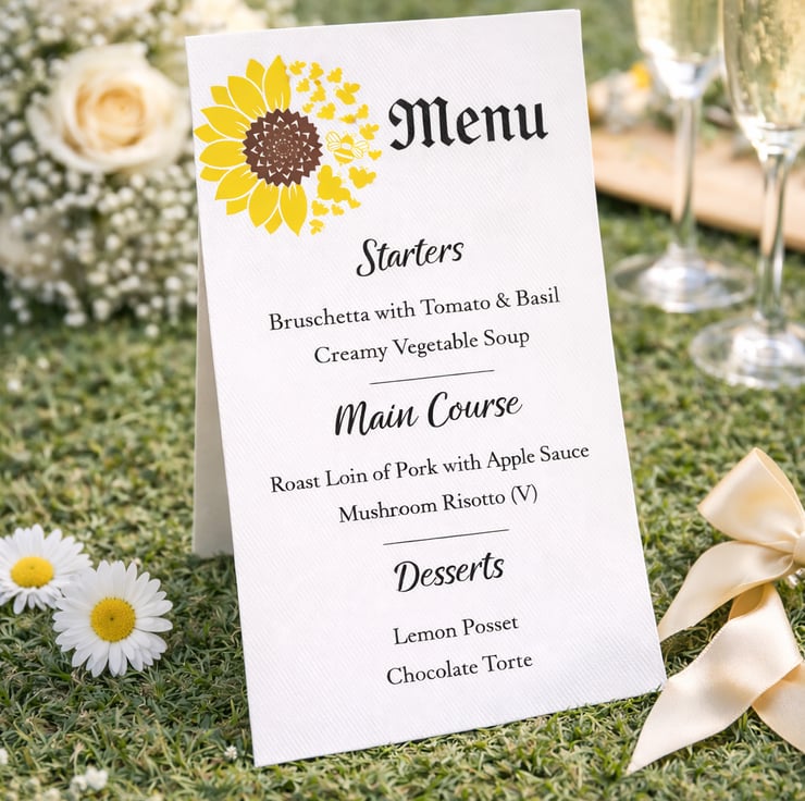 This complete wedding stationery bundle is designed for couples who want a beautifully coordinated, premium finish across every stage of their wedding day. Featuring a bold sunflower design with delicate butterfly details and elegant gothic-style typography, this set brings warmth, character and timeless style to your celebration.