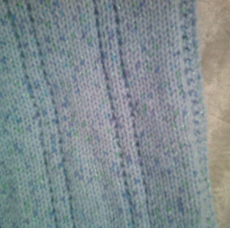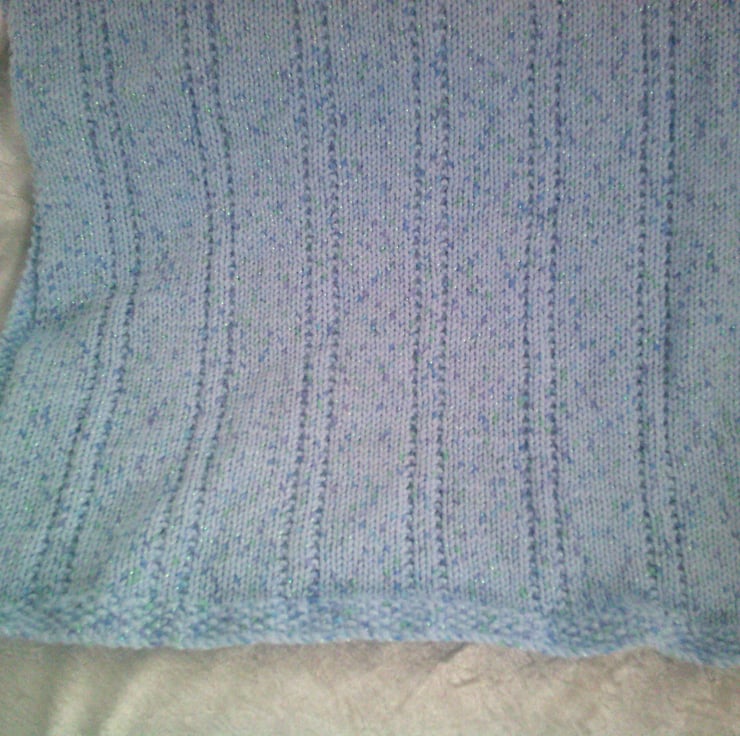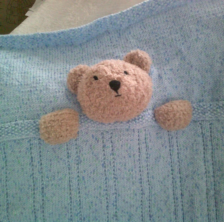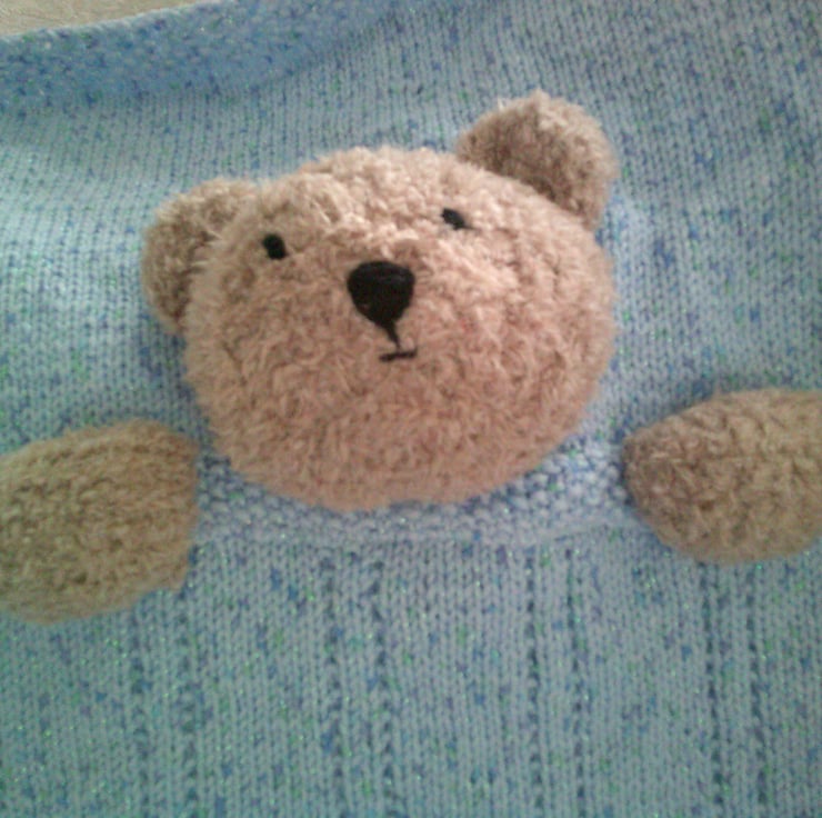This handed knitted Blue blanket is made using a sparkly yarn with darker blue and green flecks and has a teddy bear head and looks as though he is tucked up in bed all cosy and warm.