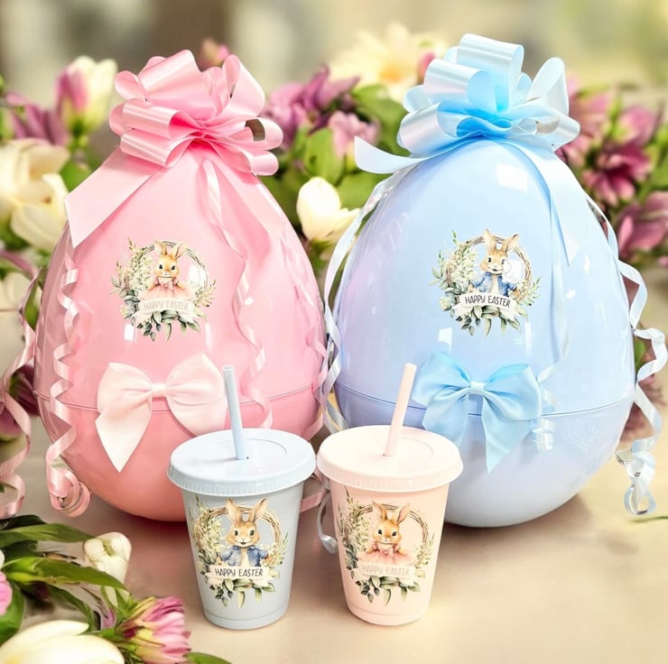 A 14 inch jumbo egg in pink or blue with matching cup and cellophane to wrap and pull
