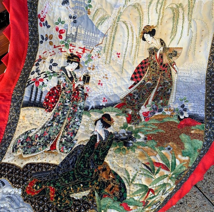 I have hand quilted this beautifful wall hanging in mostley gold metalic thread and white thread, it depicts three Geisha girls in a garden .