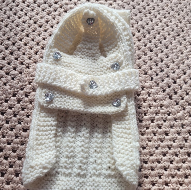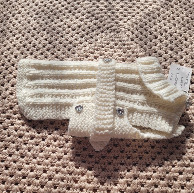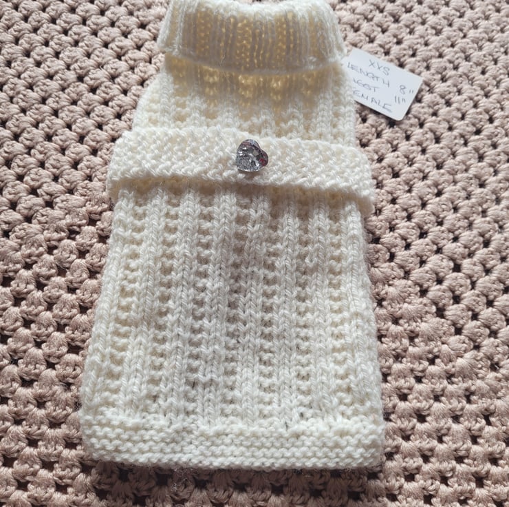 Hand knitted in off white yarn . Has heart shaped silver sparkle buttons. Comes with matching Bandana. Size xxs. Length 8 inches. Chest 11 inches. Handbag dog. Would suit a little girl who likes a bit of bling.. fixed underside. Machine washable on low.