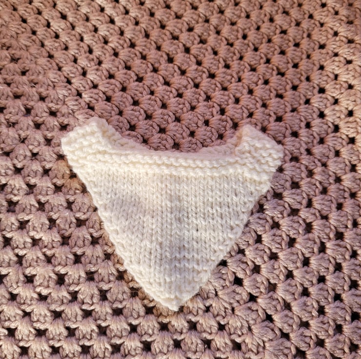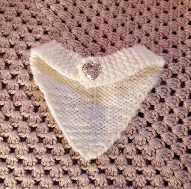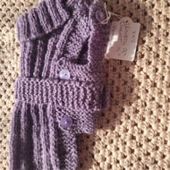A cute little coat and matching Bandana. Hand knitted using garter and double rib stitch. Complimented by the heart shaped silver diamond effect buttons just adds a bit of bling.