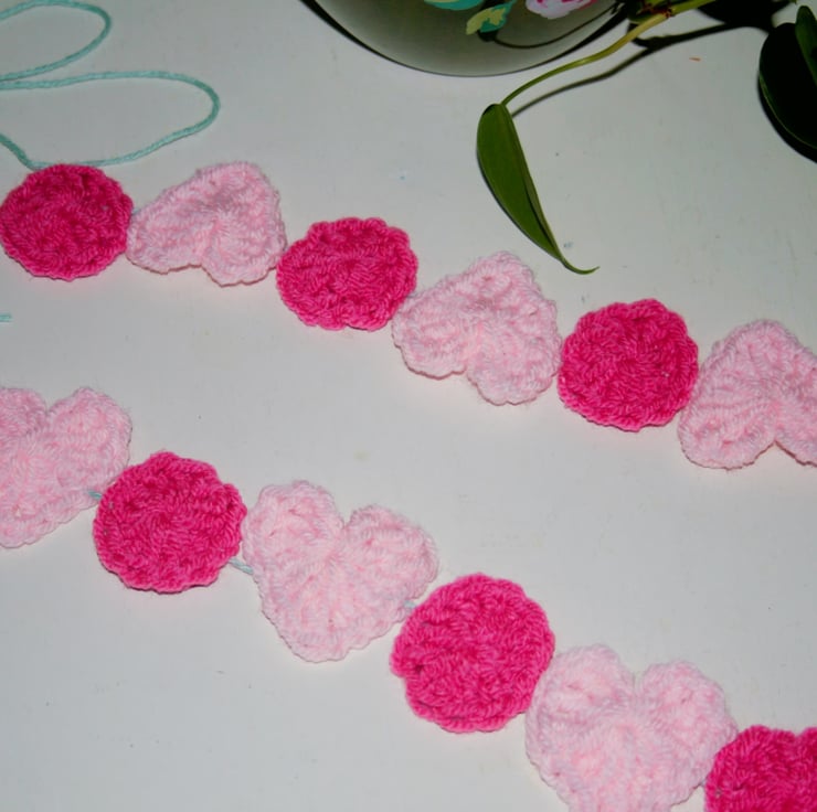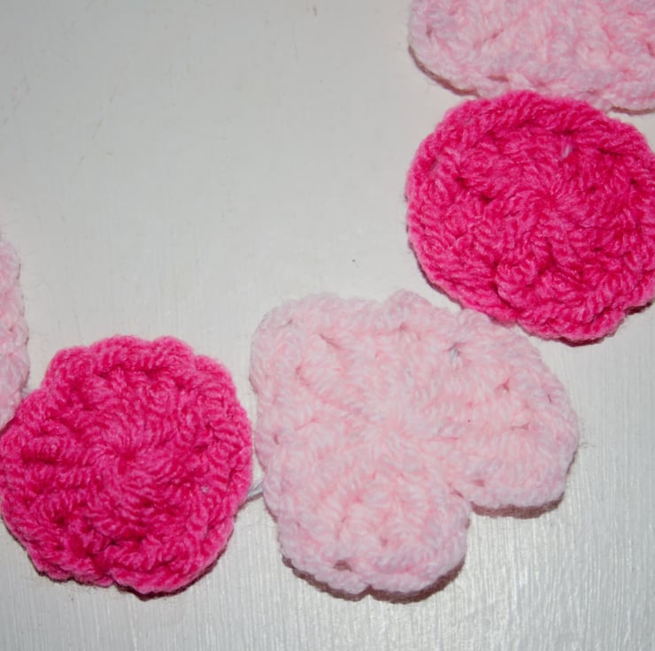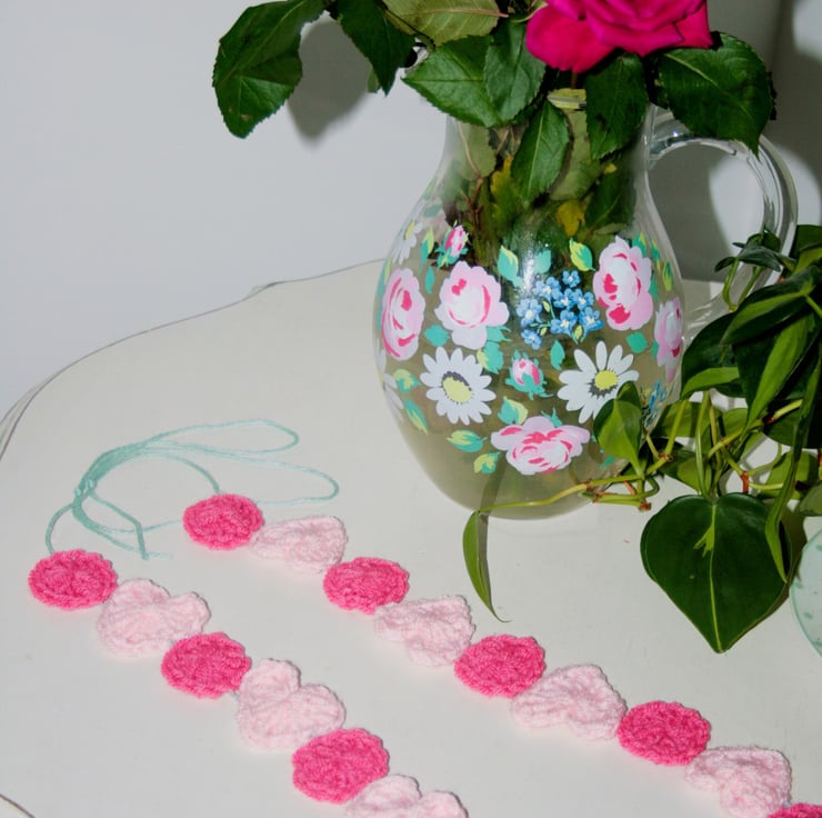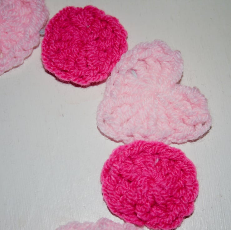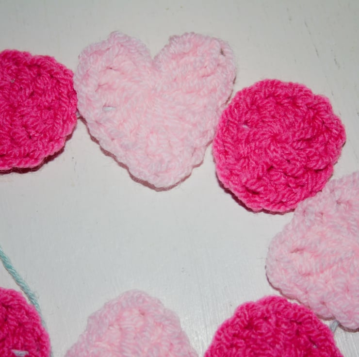 A very pretty, colourful pink heart and circle garland that I have crocheted and sewn together onto a very pretty and soft Mint yarn for hanging. The pretty mint soft yarn for hanging is made of 60% cotton and 40% Linen. The pale and bright pink yarn are both made of 100 % acrylic yarn. The little garland measures approximately 34 inches long excluding the mint loops for hanging. The little circles measure approximately one and a half inches (W) and (H). The hearts measure approximately two inches (H) and (W). There are nine hearts in total and ten little circles.