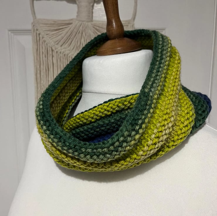 Hand Knitted Cowl Neck Warmer: Chunky Wool Navy & Lime 60 x 22cms