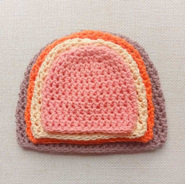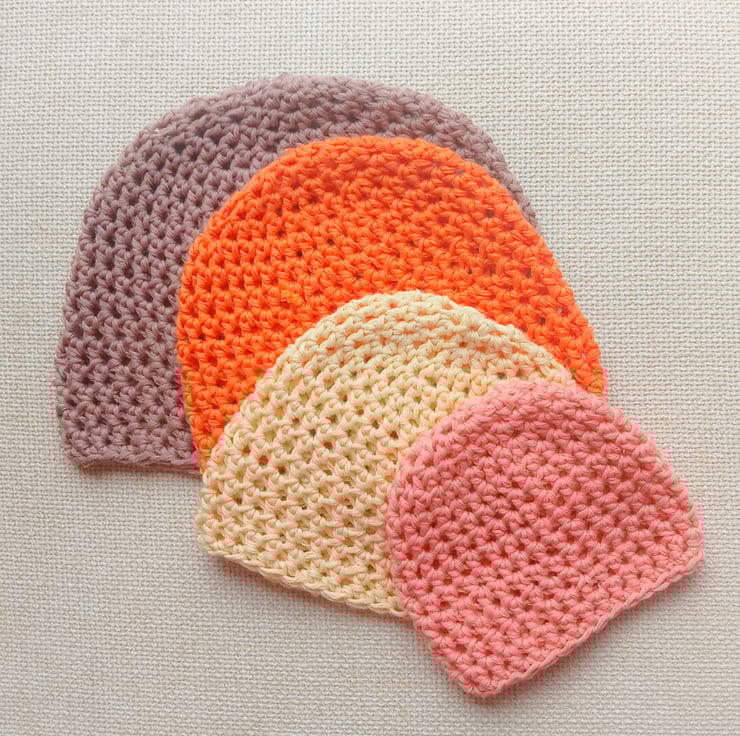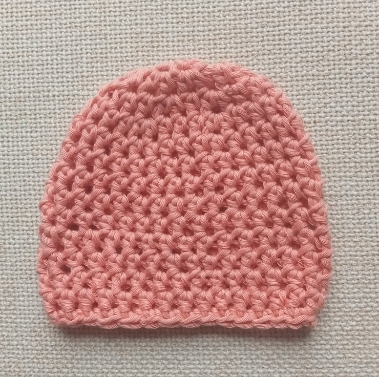 To fit: Preemie Baby, 5-6 lbs. To fit head circumference: 25.5 cm or 10.5 inches. Length: 10.5 cm or 4.25 inches. It is crochet in double knitting yarn using 4.5 mm crochet hook. It is crochet in the round.