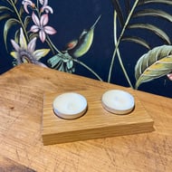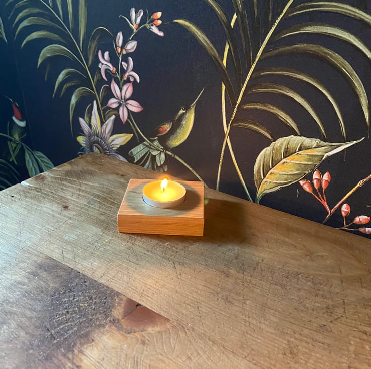 Reclaimed from oak flooring this t-light will look good in any setting. Size is approximately 65mm by 75mm by 20mm thick and waxed with beeswax to bring out the natural finish. Supplied with a fresh candle.