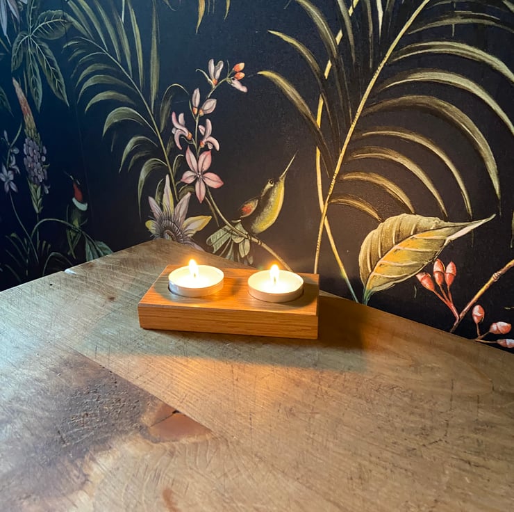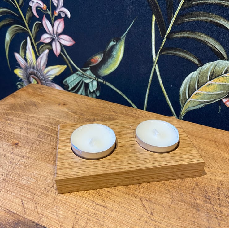 Reclaimed from oak flooring this double t-light holder will look good in any setting. Size is approximately 65mm by 120mm by 20mm thick and finished with beeswax to bring out the grain. Supplied with fresh candles.