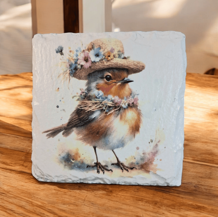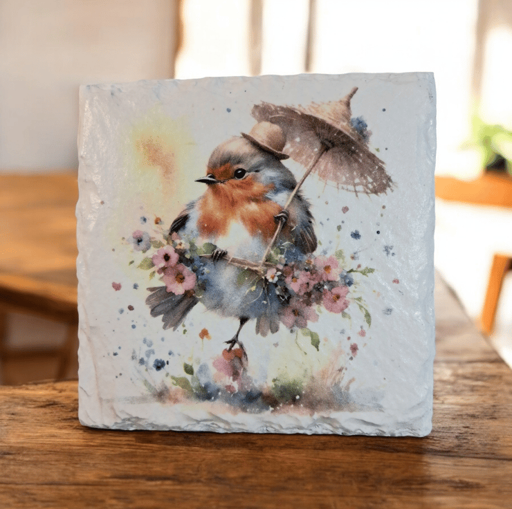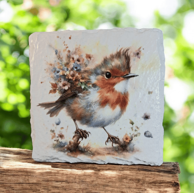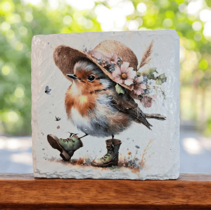 This 4 piece decoupaged coaster set has been hand painted and decoupaged with beautiful Robins having fun.