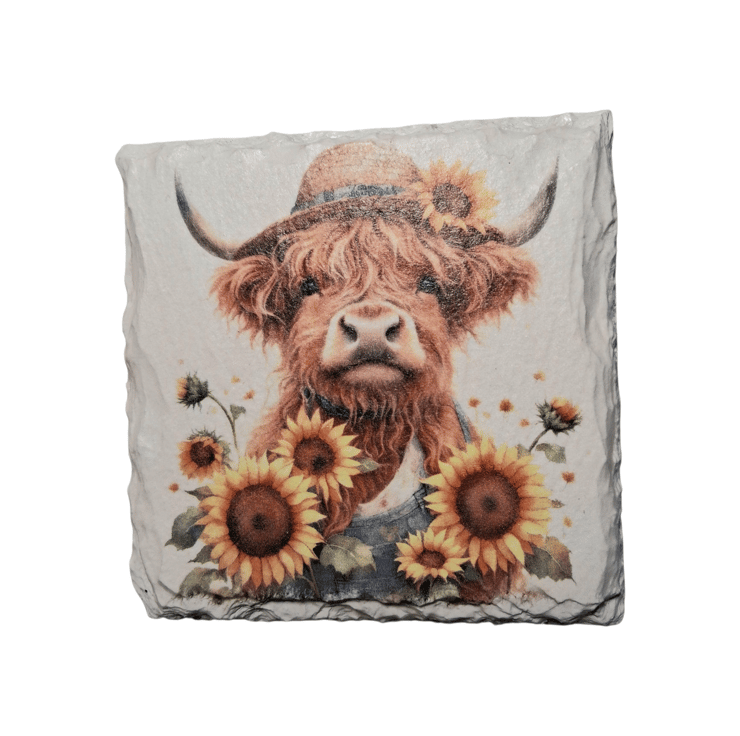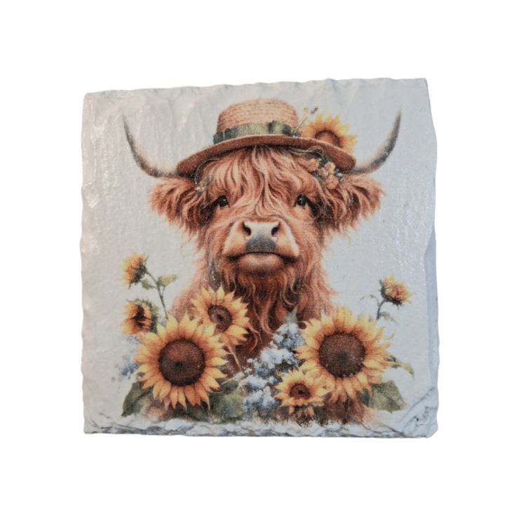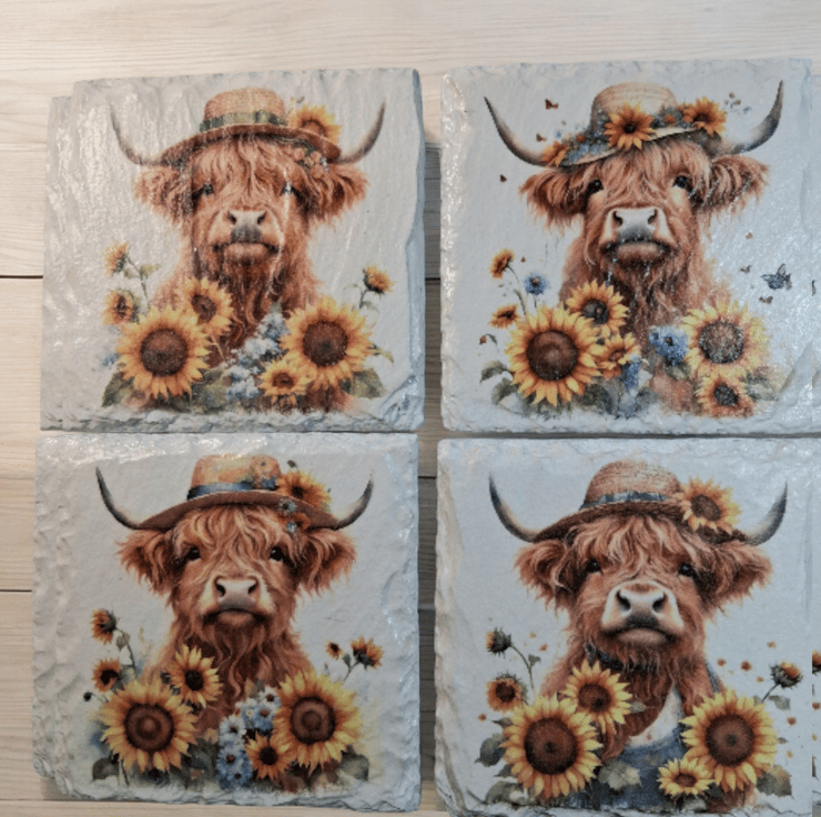 This 4 piece slate coaster set has been hand painted and decoupaged with beautiful Highland Cow wearing a straw hat and decorated with yellow sunflowers.