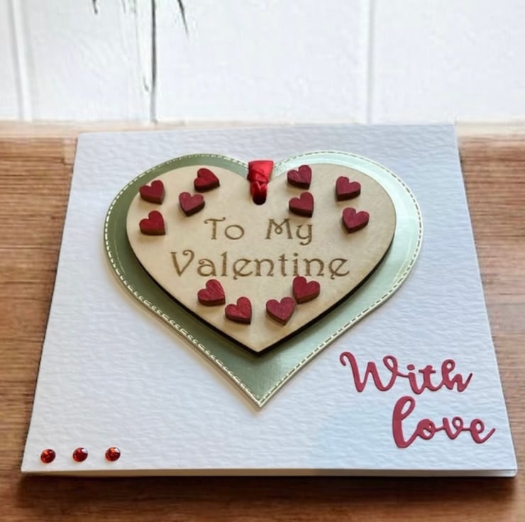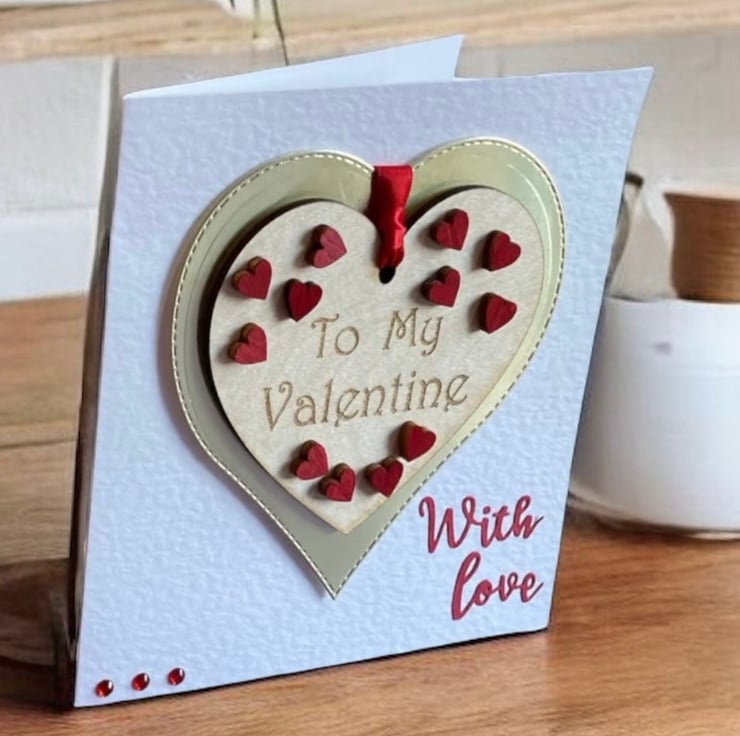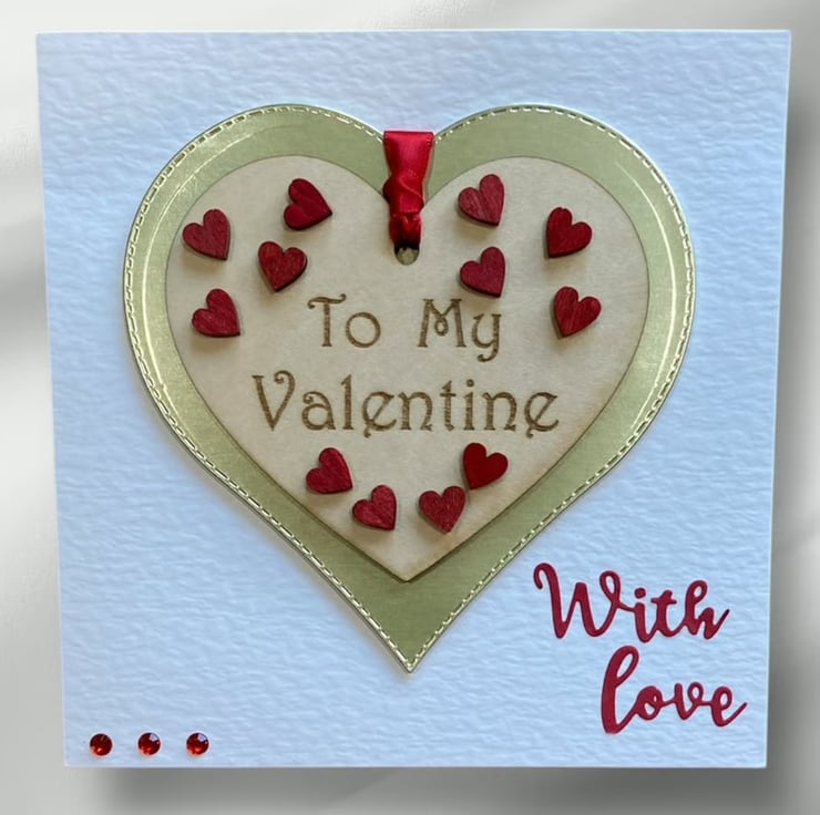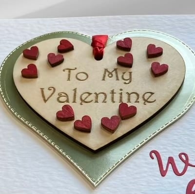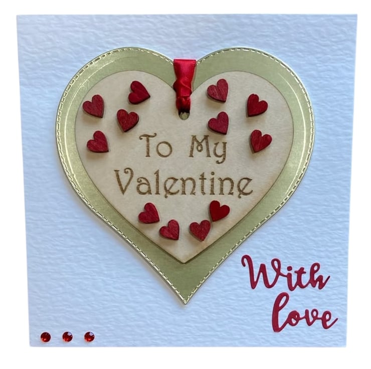 This striking handmade Valentine’s card features a luxurious white hammered card base, beautifully layered with a gold die-cut heart for an elegant finish. At the centre sits a handmade laser-engraved wooden heart keepsake, measuring approximately 9.5 x 8.5 cm, engraved with the heartfelt words “To My Valentine” and decorated with delicate little red wooden hearts.