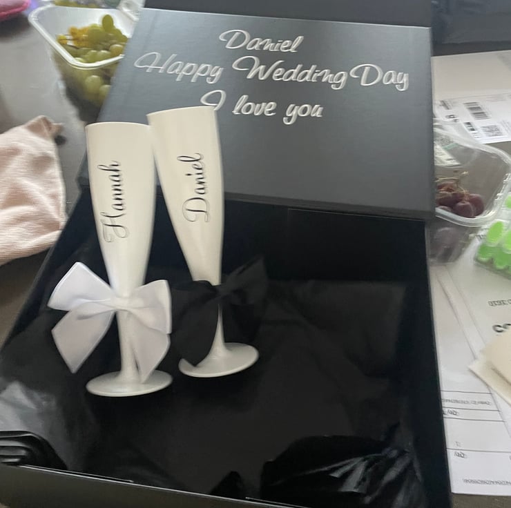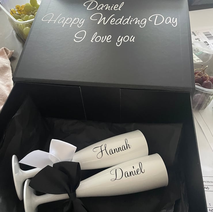 A deep filled black A4 box featuring two plastic personalised champagne glasss