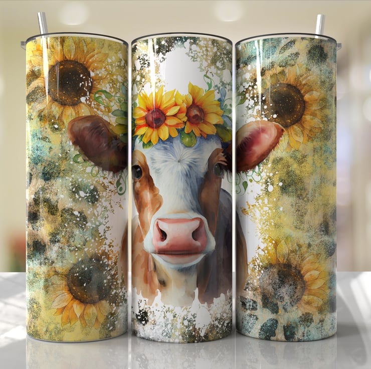A 20oz tumbler with a spring cow on that has been sublimnated pattern all round the cup