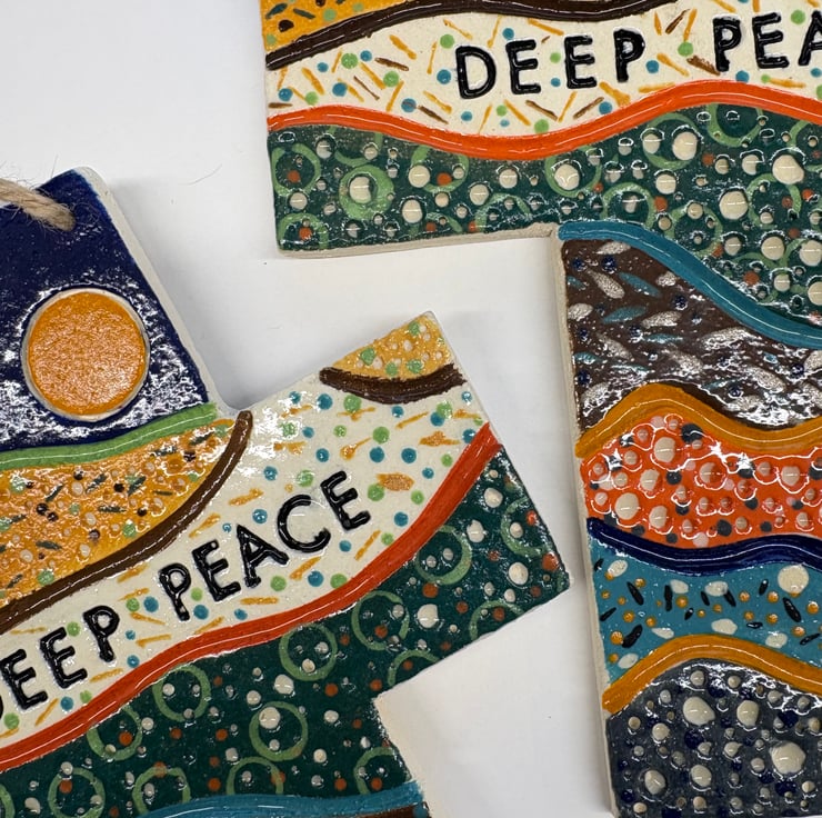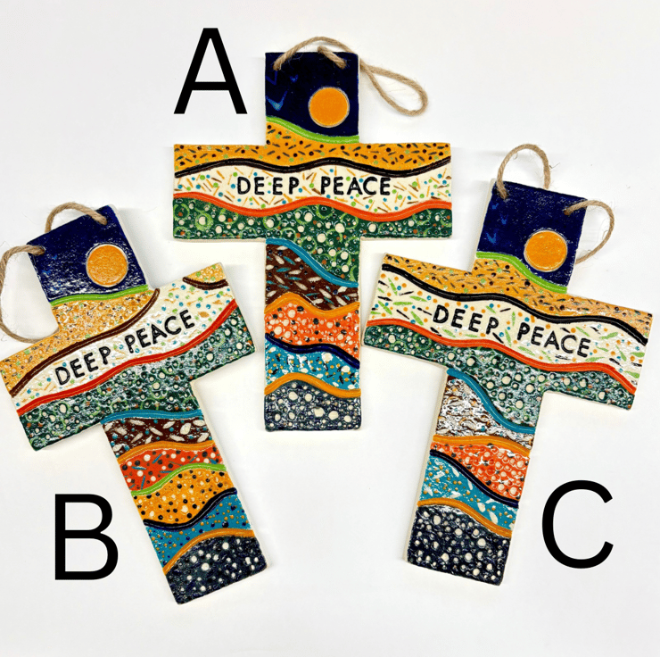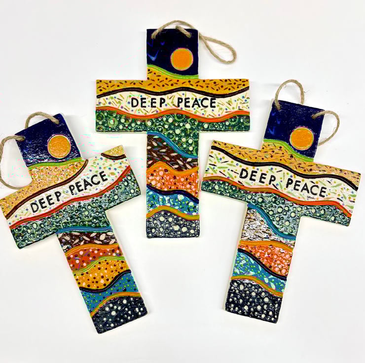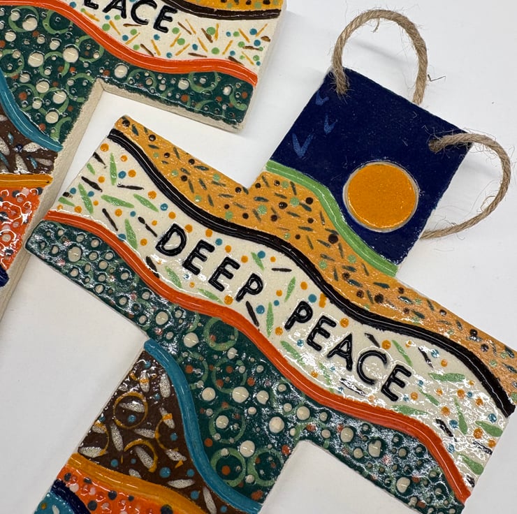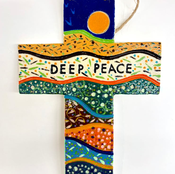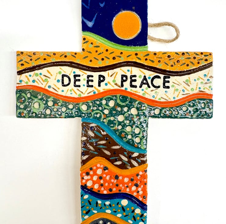 This handmade ceramic cross has been painstakingly decorated with a detailed landscape motif using textured surface and a variety or coloured underglazes. The ‘Deep Peace’ motto is taken from a beautiful Gaelic Blessing. The piece is made of stoneware and finished with a clear glaze so that it could be hung indoors or outside. Each cross measures approximately 22 x 14cms (please choose which one you would like at checkout) . These special pieces would make a lovely present for a special occasion, perhaps a baptism or ordination.