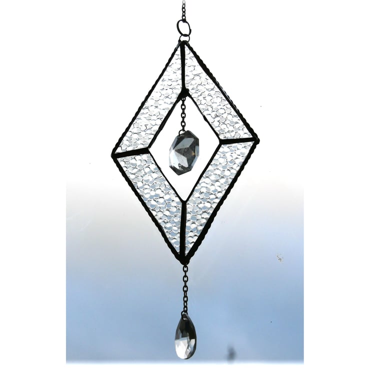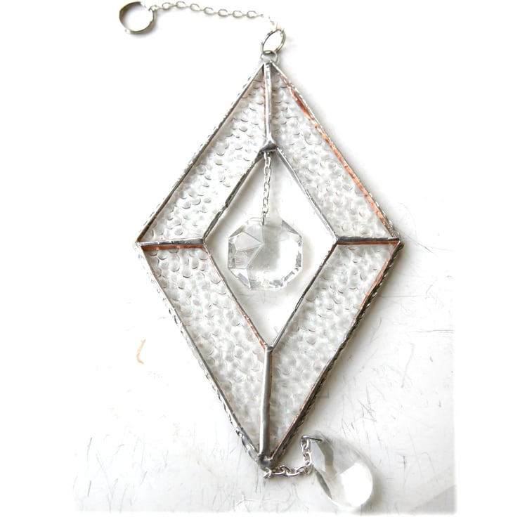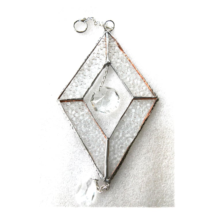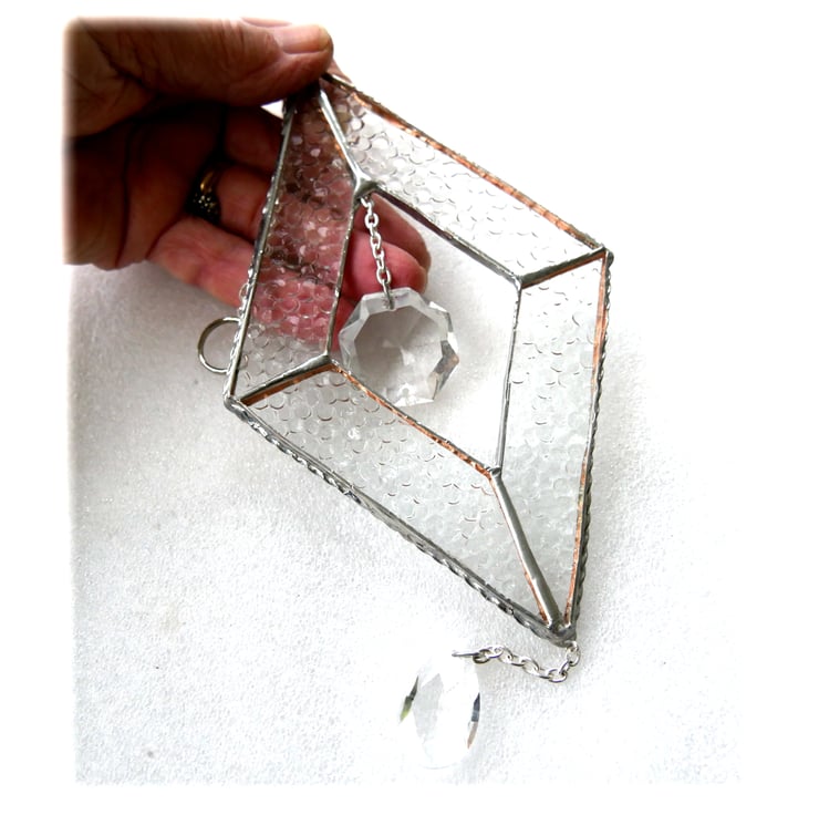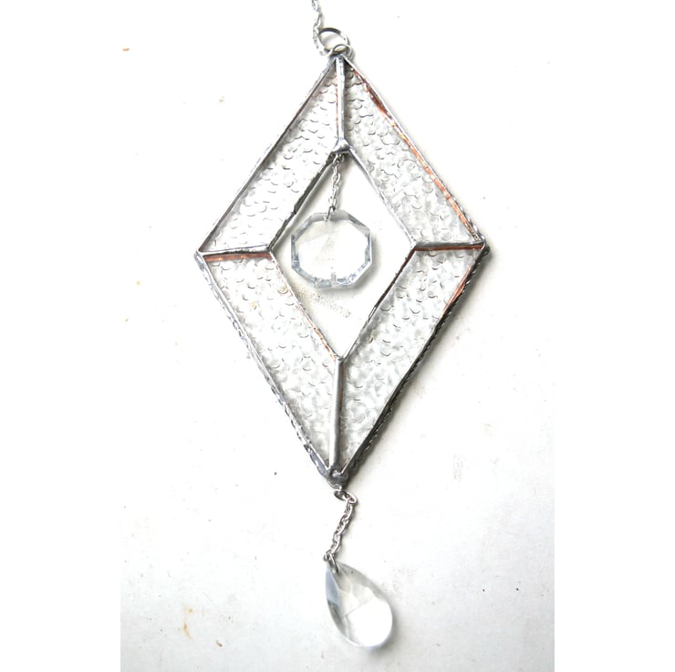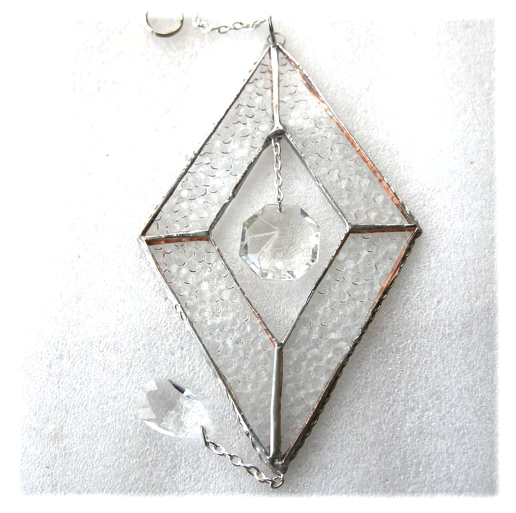 It comprises a simple diamond suncatcher cut from clear diamond textured glass. Inside the diamond I have hung a rather large crystal, a genuine chandelier type from a little silver chain. Under the diamond I have hung another crystal but this time a teardrop shape again from silver chain.