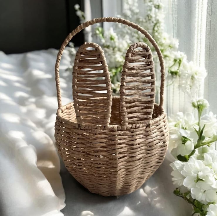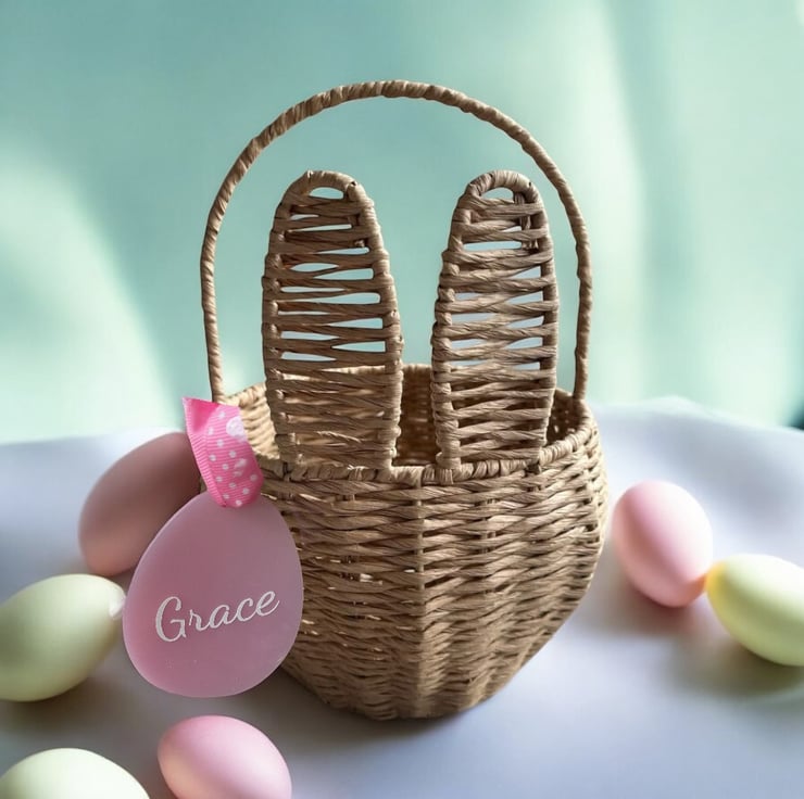 A stunning Easter basket with bunny ears the size is approx 30cms in height and diameter 35cms so you will get a nice amount of eggs in or a bunny finished with acrylic egg personalised with child’s name in pink or blue or white or green simple message me name and colour