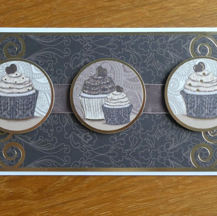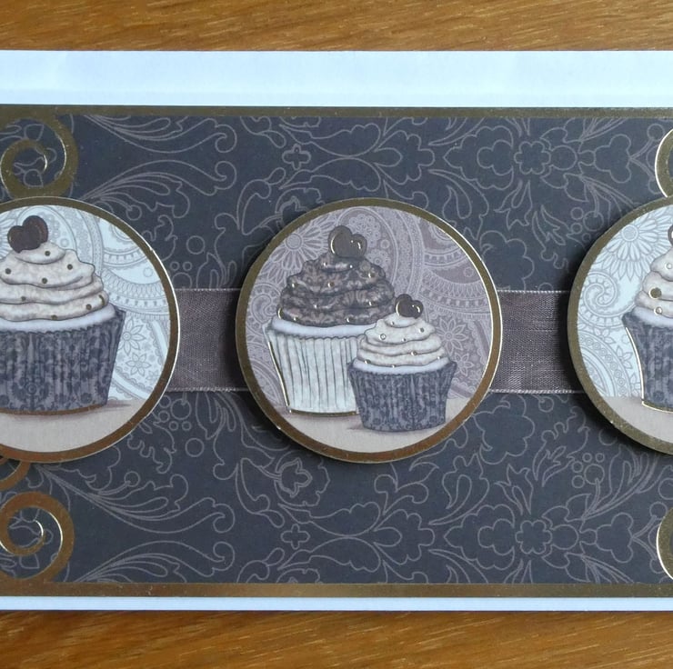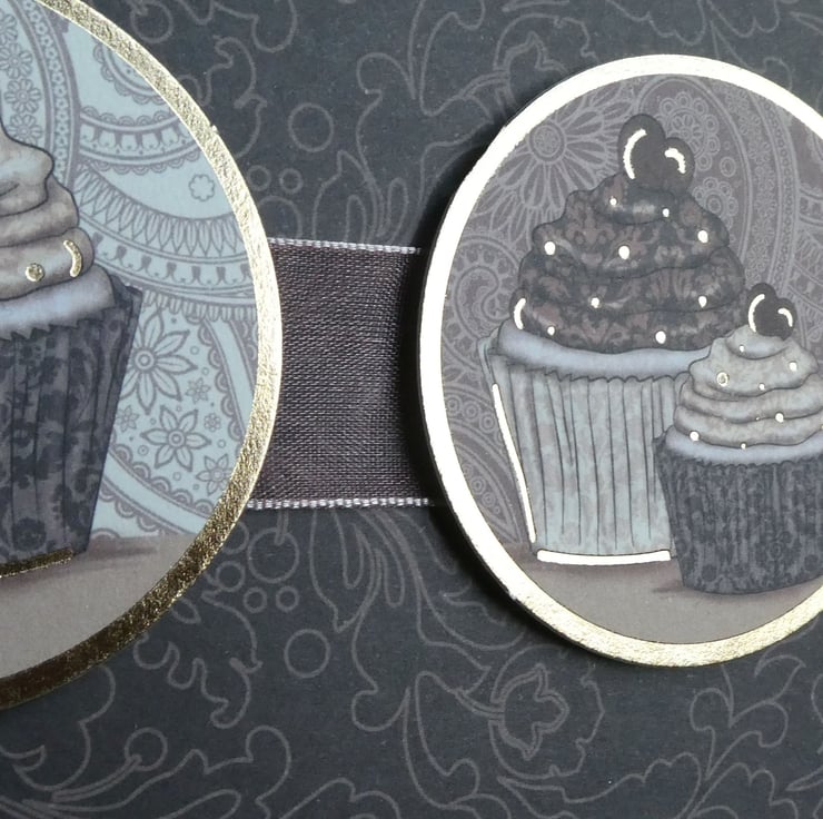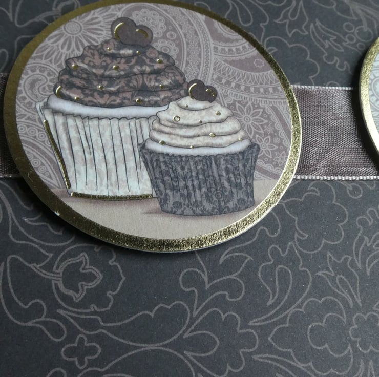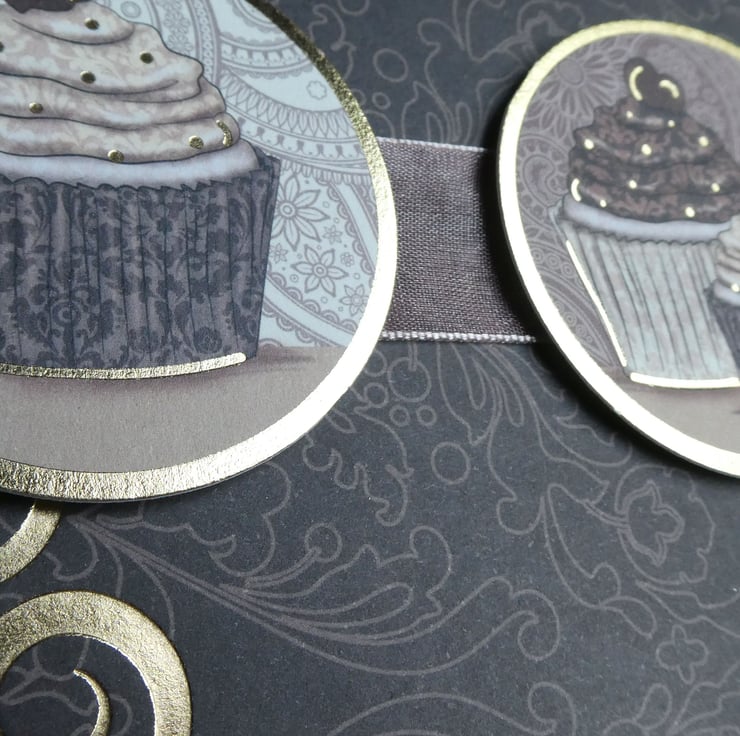 The cupcake images have been printed in shades of brown and cream with gold foiled details and die cut into circular shapes, all with gold foiled frames.