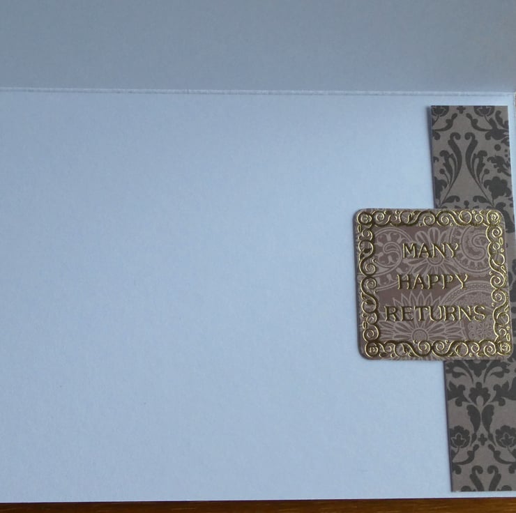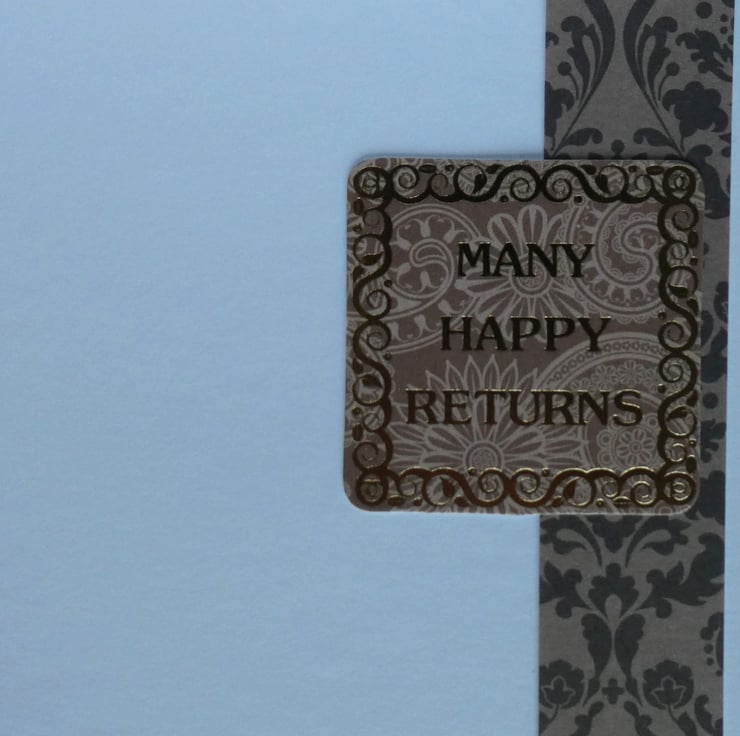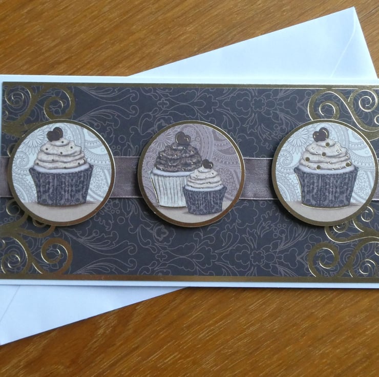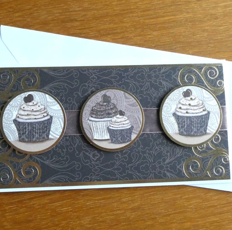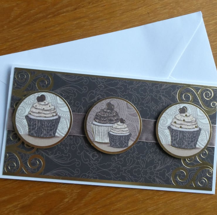 This Birthday card with a row of 3 cupcakes on a background of chocolate brown and gold foiled accents and the message 'Many Happy Returns' would be ideal to send to someone with a love for cake.
