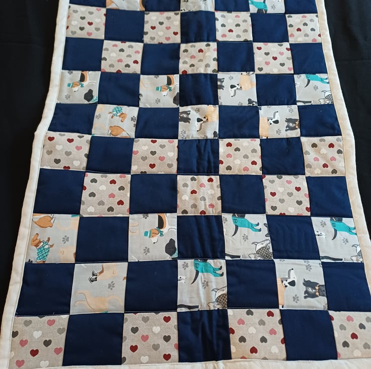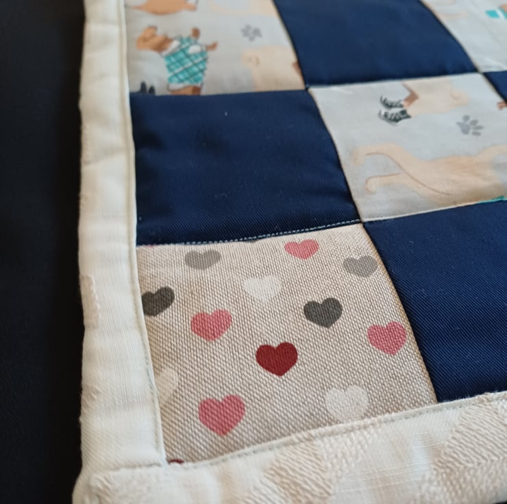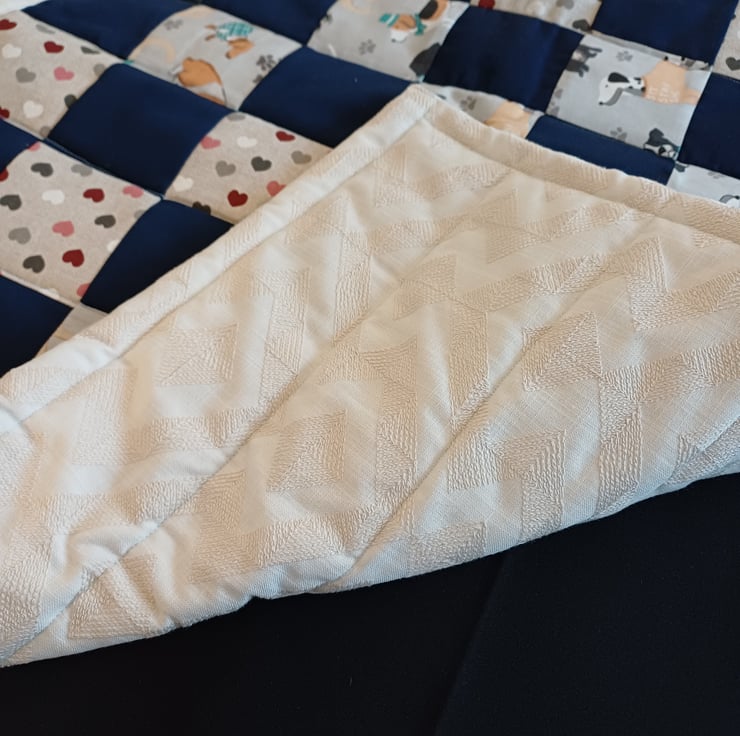 This beautiful dog blanket is made of 3 layers, the top layer is a mixture of linen, cotton, and poly cotton. the middle layer is a thick wadding and then the bottom layer is 100% cotton upholstery material, perfect for any dog who likes to rag their blanket about, the blanket can be washed on a normal wash and is perfect for the car, sofa bed or just to keep in the car for outings. Please see photos for measurements