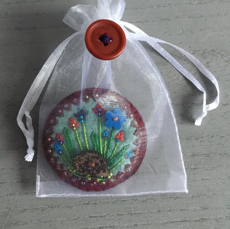 This Hand Embroidered Floral Hedgehog Brooch is gift wrapped in an organza bag, decorated with a red button. Also a protective bag to keep the brooch in when not worn.